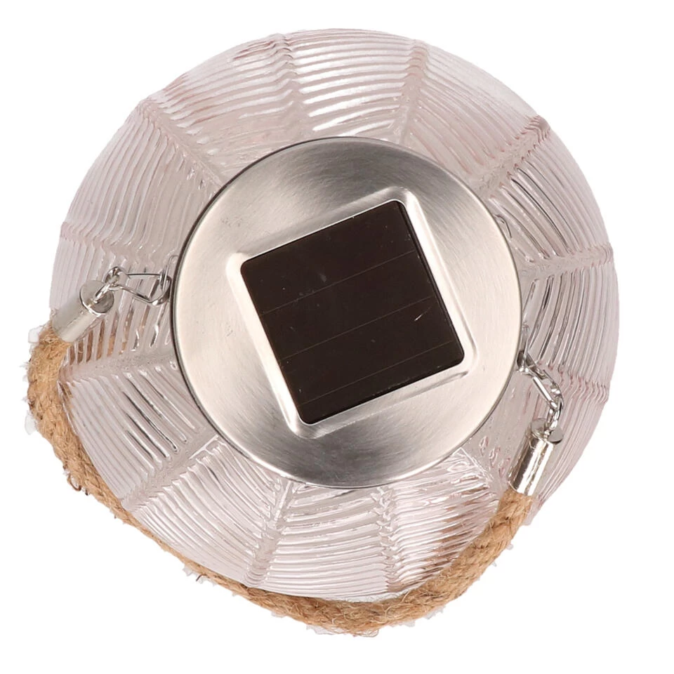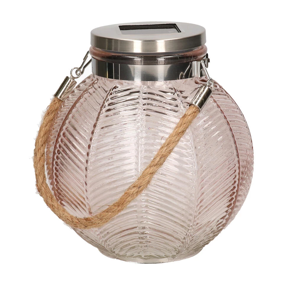 Roze solar lantaarn van glas rond. De verlichting werkt op zonne-energie waardoor het zichzelf oplaadt gedurende de dag. U kunt de lantaarn neerzetten of ophangen aan het handvat van touw voor een gezellige sfeer in de tuin, bijvoorbeeld op tafel of aan houders voor hangplanten. Formaat: 16 x 14,5 cm. Kleur licht: warm wit. Kleur lamp: roze. Materiaal: gestreept glas.
