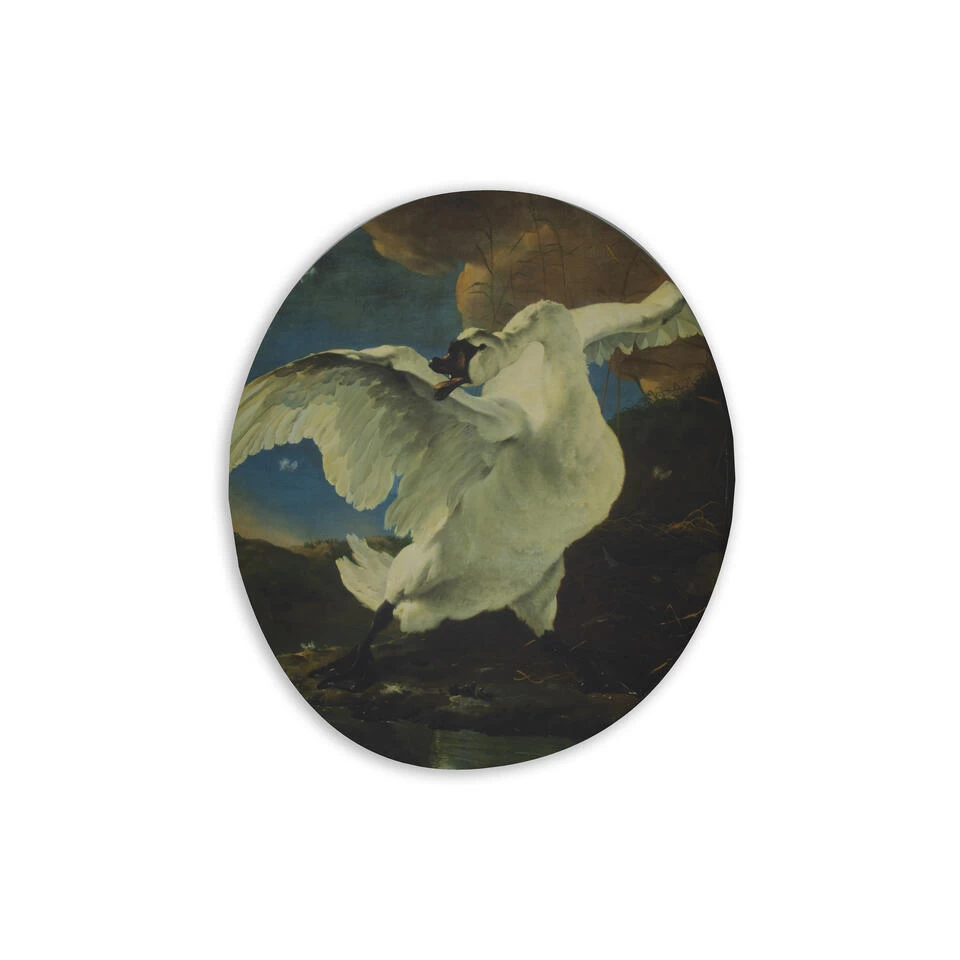 Deze indrukwekkende zwaan geschilderd door Jan Asselijn verdedigd haar nest. Een echte blikvanger door het gebruik van licht en de intense witte kleur van de zwaan.