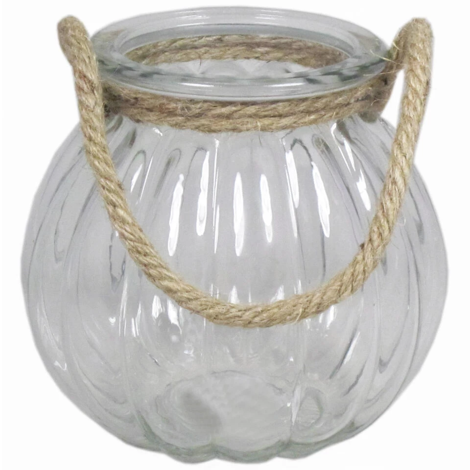 Glazen ronde windlicht 2 liter met touw hengsel/handvat 14,5 x 14,5 cm. Een stevige glazen windlicht, welke rond uitloopt en een smallere hals heeft. Geschikt om kaarsen en waxinelichtjes in te plaatsen.