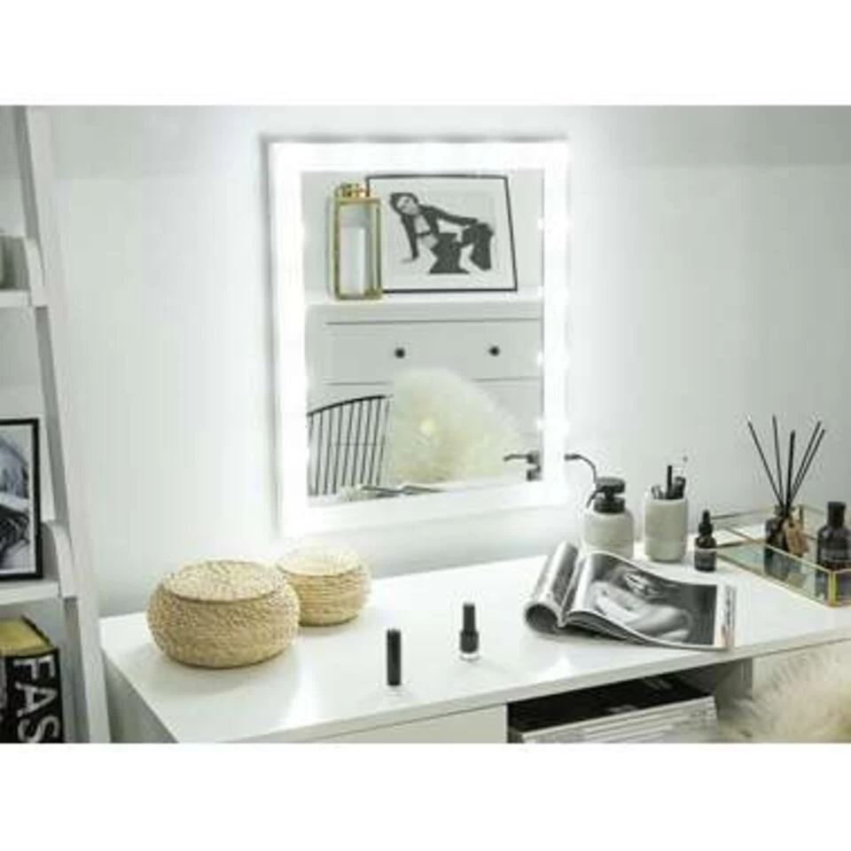 Rechthoekige, witte wandspiegel met LED verlichting. Of het nu in de slaapkamer boven de kaptafel of in de badkamer boven je wastafel is, deze klassieke spiegel is overal een praktisch woonaccessoire. Dankzij de LED-verlichting in het frame is make-up, dagelijkse gezichtsverzorging of scheren kinderspel! De aanraaksensor zorgt voor een eenvoudige en snelle regeling van de licht-intensiteit.