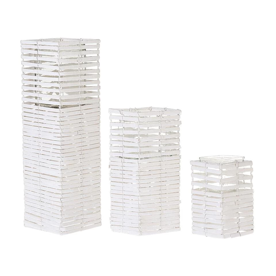Moderne, charmante kandelaars voor jouw huis. Deze set van drie kandelaars in verschillende maten zijn een charmante en moderne toevoeging aan jouw interieur. Je kunt ze apart of als set opzetten. Uiteraard komt deze set goed tot zijn recht als de kaarsjes branden. De glazen schalen zijn eenvoudig uit het houten frame te halen.