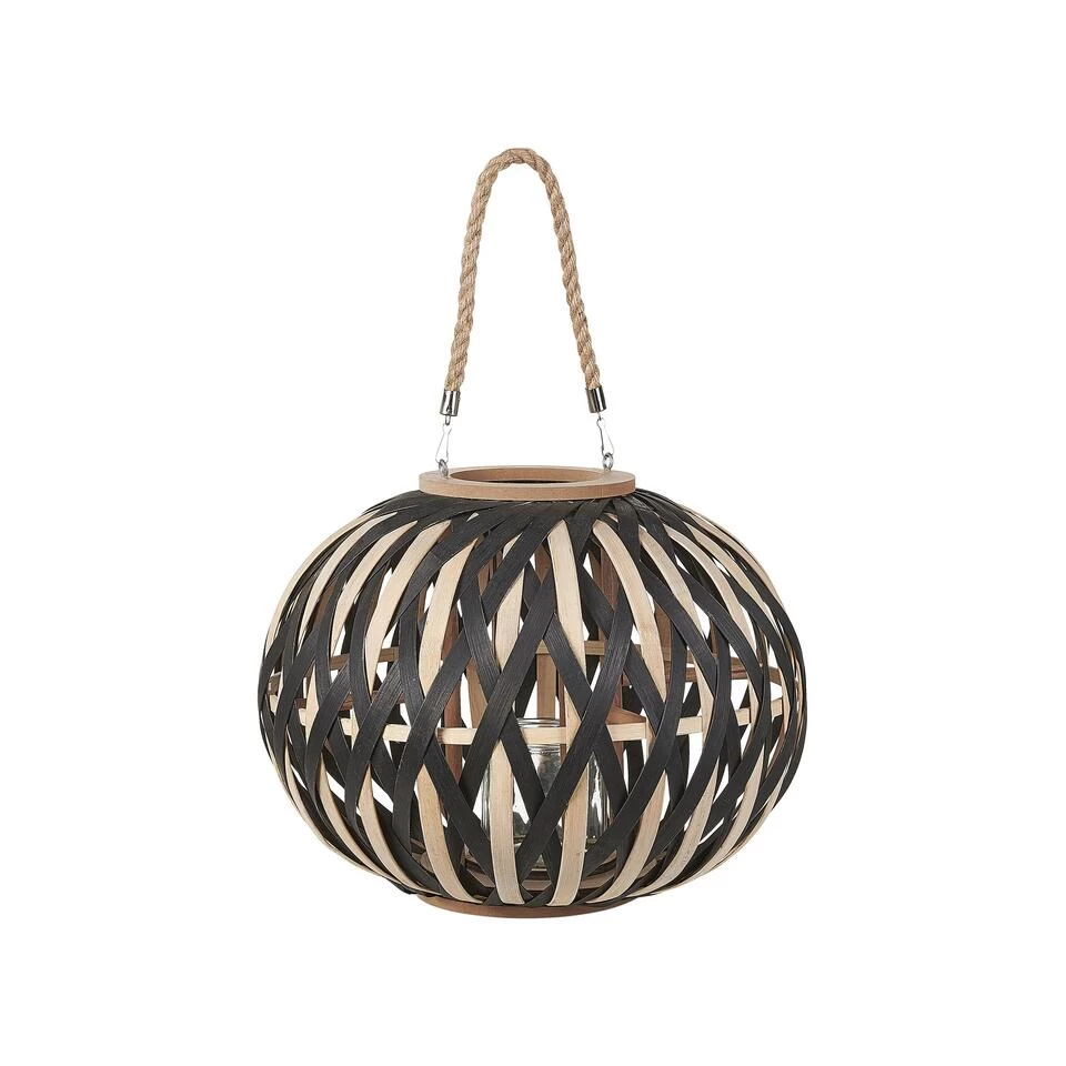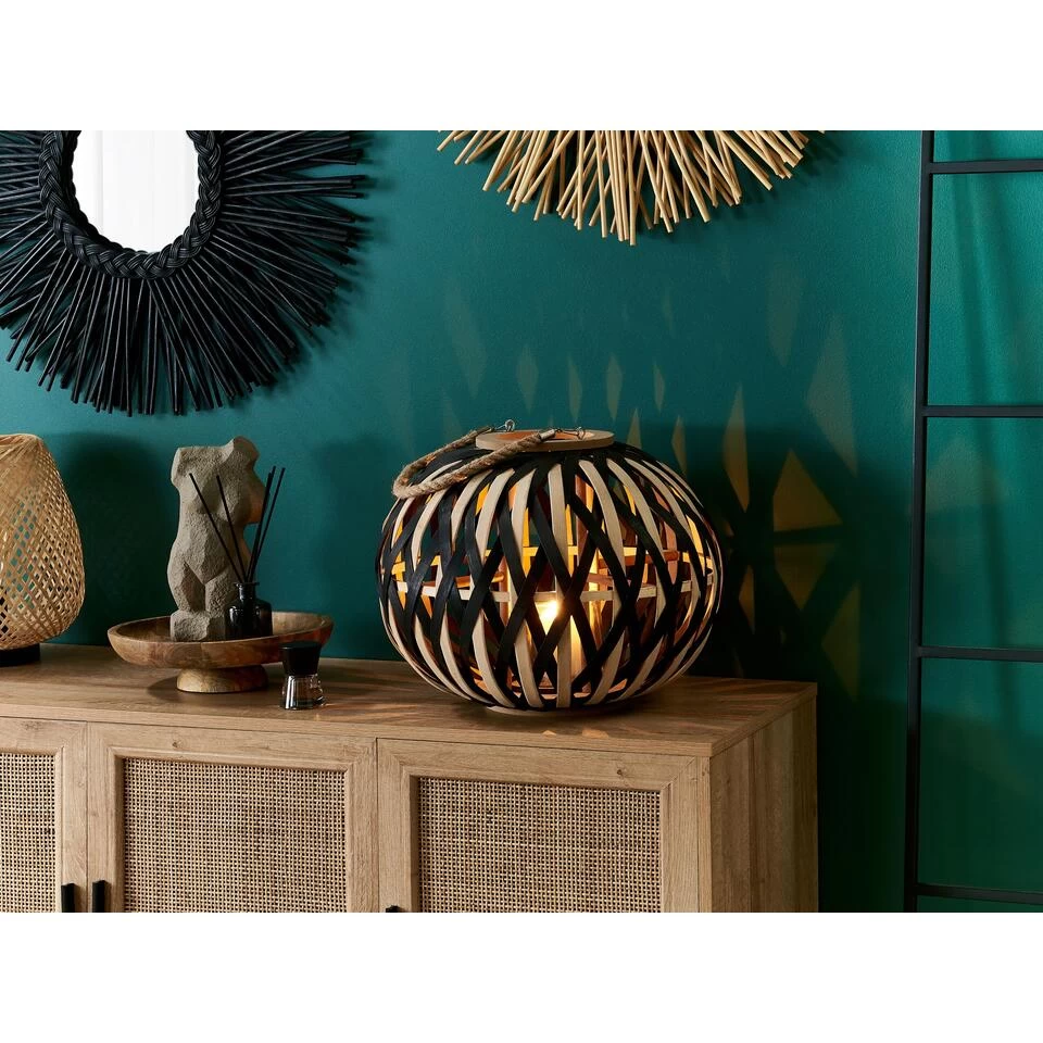 Boho Kaarsenhouder Lantaarn. Geef je woon- of slaapkamer een uniek tintje en plaats deze opvallende lantaarn op een zichtbare plek. Het accessoire is handgemaakt van stukjes bamboe in natuurlijke en zwarte kleur wat zorgt voor een interessante open structuur. Het product wordt geleverd met een stijlvol, geweven handvat waarmee u de lantaarn gemakkelijk van de ene plaats naar de andere kunt verplaatsen.
