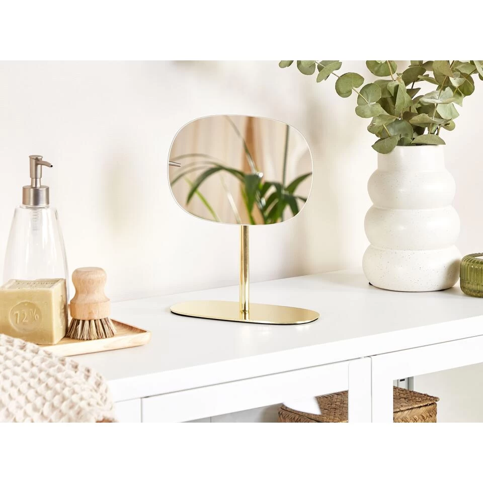 Decoratieve tafelspiegel. Op perfecte wijze make-up aanbrengen wordt gemakkelijk met deze gouden tafelspiegel. Ontworpen met een draaifunctie, waardoor je hem in elke gewenste hoek kunt plaatsen. De frameloze stijl in combinatie met een glanzende gouden standaard geeft het een glamourgevoel. Geweldig accessoire voor elke badkamer, slaapkamer of woonkamer.