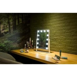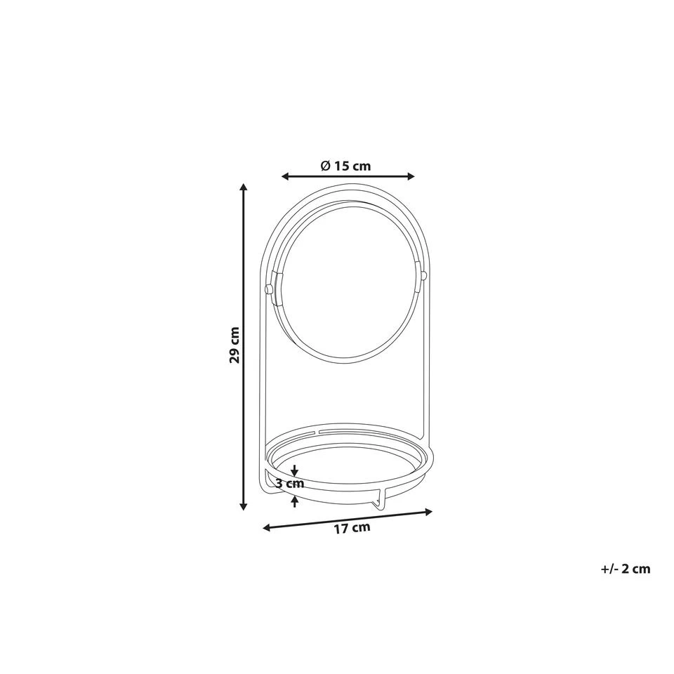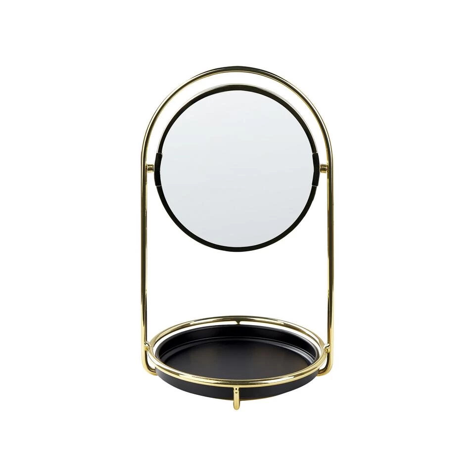 Dubbelzijdige spiegel met vergroot oppervlak. Deze dubbelzijdige spiegel is een perfecte aanvulling op je badkamer of beautyhoek. Door zijn formaat kan hij op kleinere tafels of kaptafels geplaatst worden. Het stuk heeft een dienblad, waar je verschillende make-upaccessoires en sieraden kunt plaatsen. Dankzij de gouden kleur zul je er geen problemen mee hebben om hem te combineren met verschillende interieurstijlen, maar hij zal het beste staan in moderne, glamoureuze interieurstijlen.