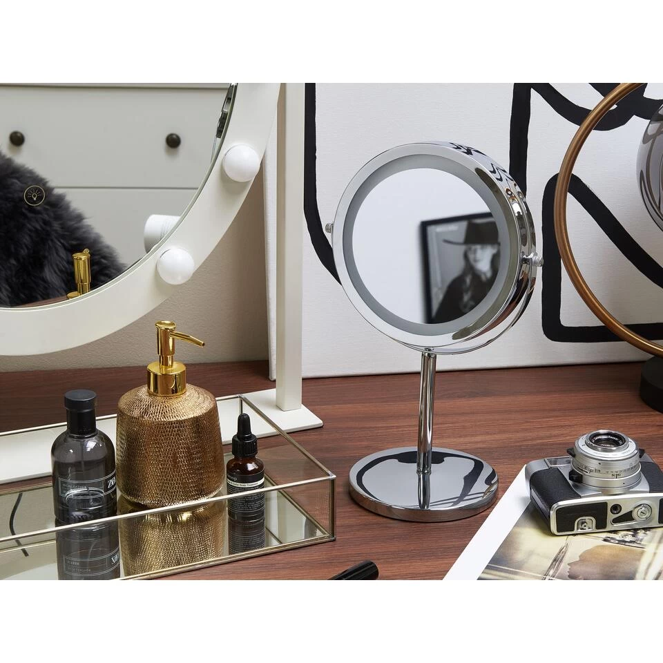 Klassieke en effectieve make-up spiegel met LED-verlichting en 5x vergroting. Of het nu in de slaapkamer of in de badkamer is, deze fantastische LED-spiegel is overal handig! De tafelspiegel is klassiek en functioneel, perfect als extra accessoire op de kaptafel voor je dagelijkse gezichtsverzorging. Dankzij de praktische aanraaksensor kan de lichtintensiteit snel en eenvoudig worden ingesteld. Het ronde, klassieke zilverkleurige frame zorgt voor een mooi en elegant effect en laat elke inrichting stralen met zijn aangenaam warme lichttint.