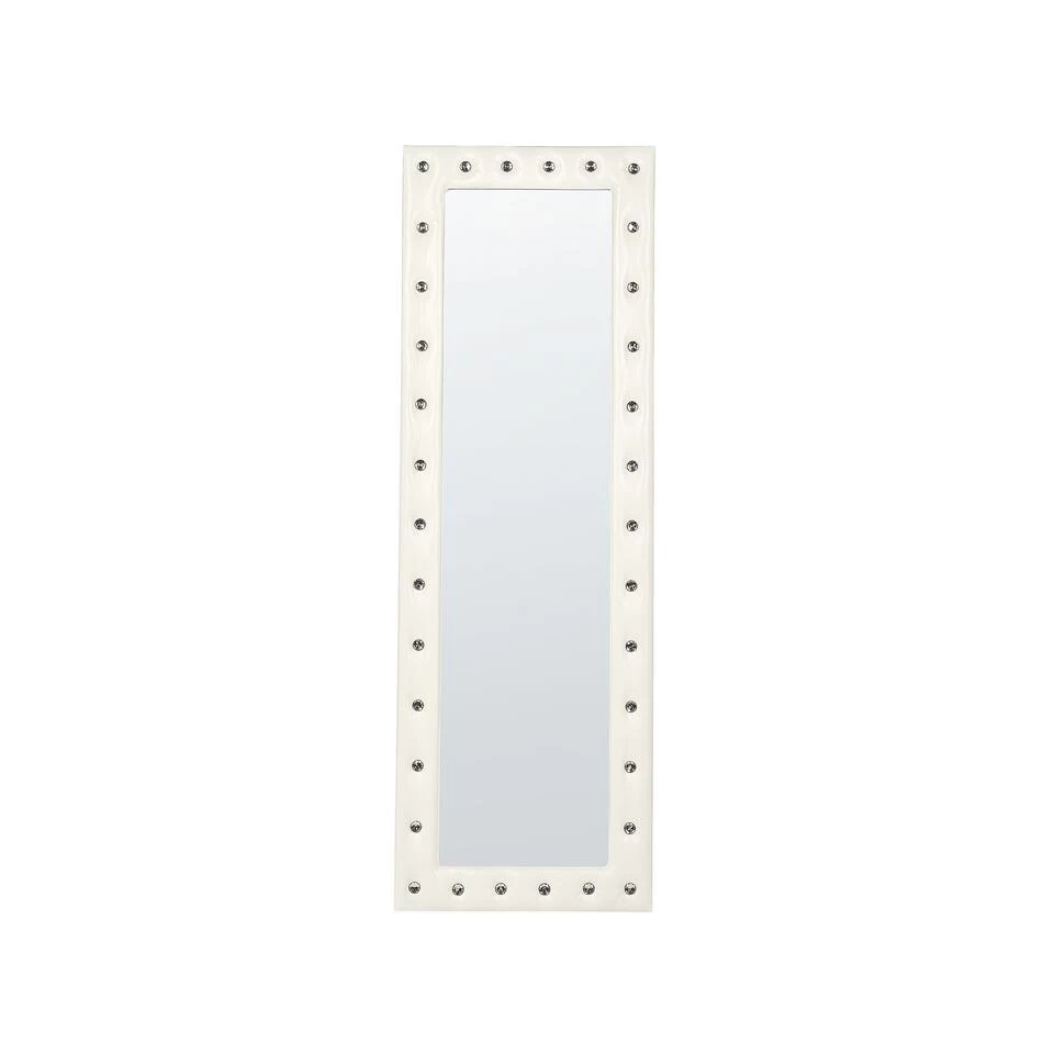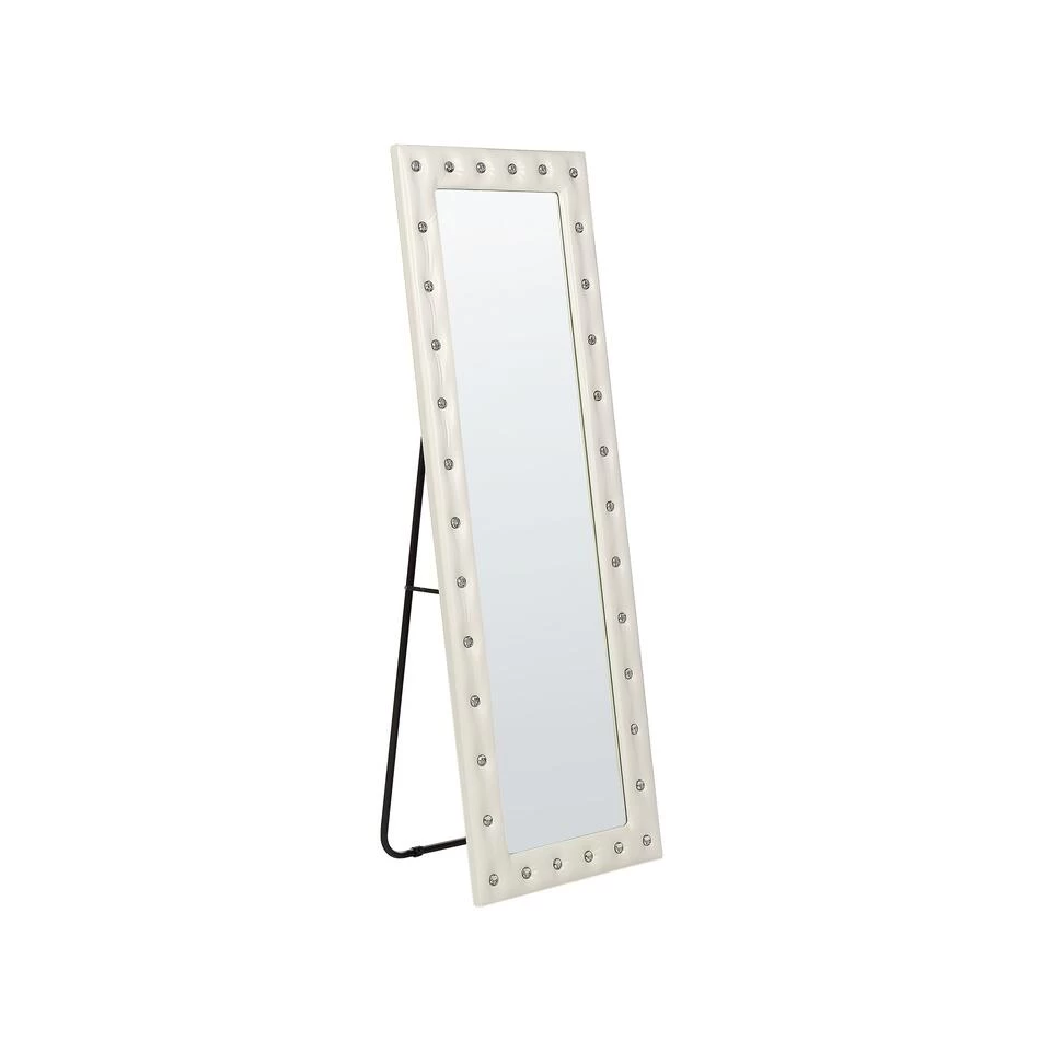 Glamour vloerspiegel met frame van PU-leer. Deze stijlvolle staande spiegel verandert je slaapkamer in een elegante mastersuite. Handgemaakt met oog voor detail en bekleed met een leerachtige PU-stof. Charmante strassteentjes van acrylglas onderstrepen het chique karakter. De spiegel zal een prachtige decoratie zijn voor elke kamer in zowel glamour als moderne stijl. Dankzij een metalen standaard kun je de spiegel plaatsen waar je maar wilt, en horizontaal of verticaal aan je muur hangen met behulp van haken aan de achterkant.