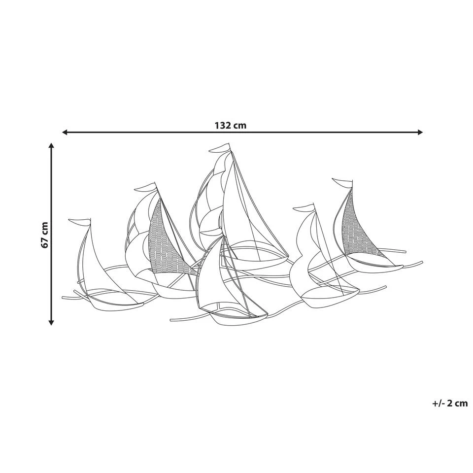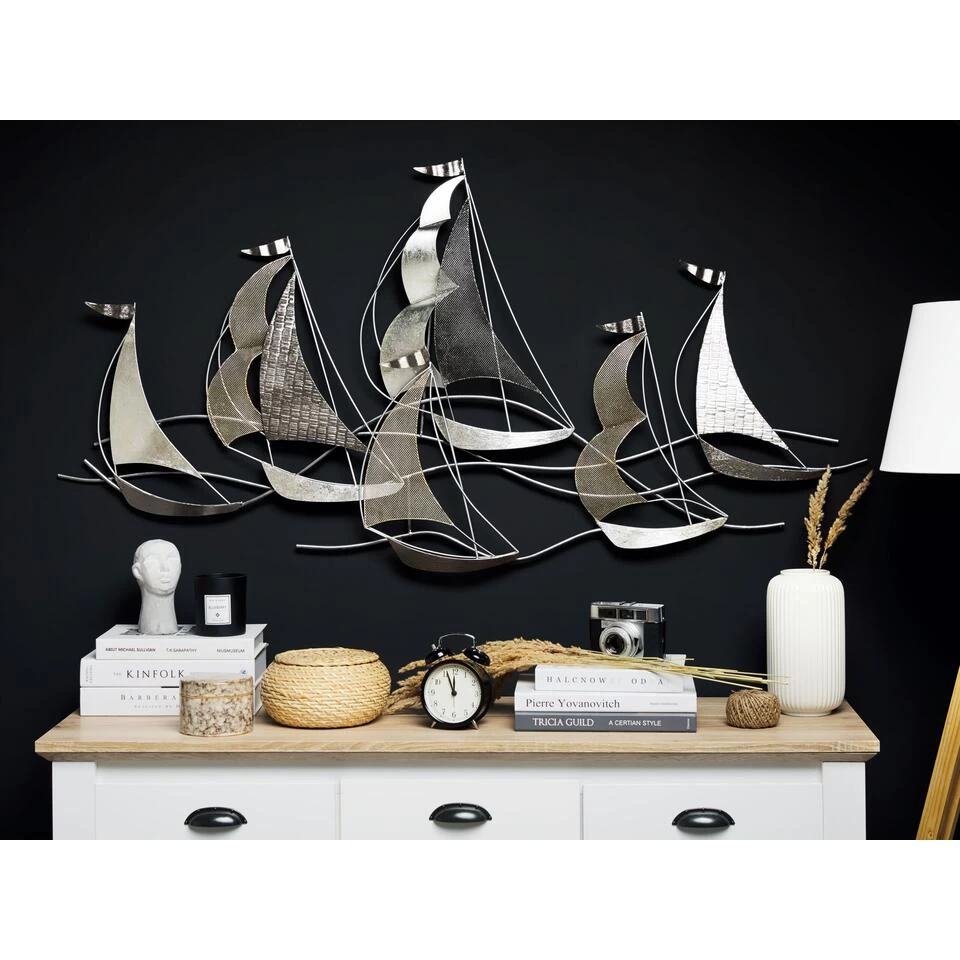 Metalen wanddecoratie met marine thema. Geef je interieur een maritieme sfeer dankzij deze opvallende wanddecoratie. De 3D-compositie van zilverkleurige boten ziet er goed uit op lichte en donkere muren. Het stuk is gemaakt van hoogwaardig metaal dat stabiliteit en duurzaamheid garandeert. Hang hem boven de open haard, kast of bank en geniet van de schoonheid van deze ware eye-catcher.