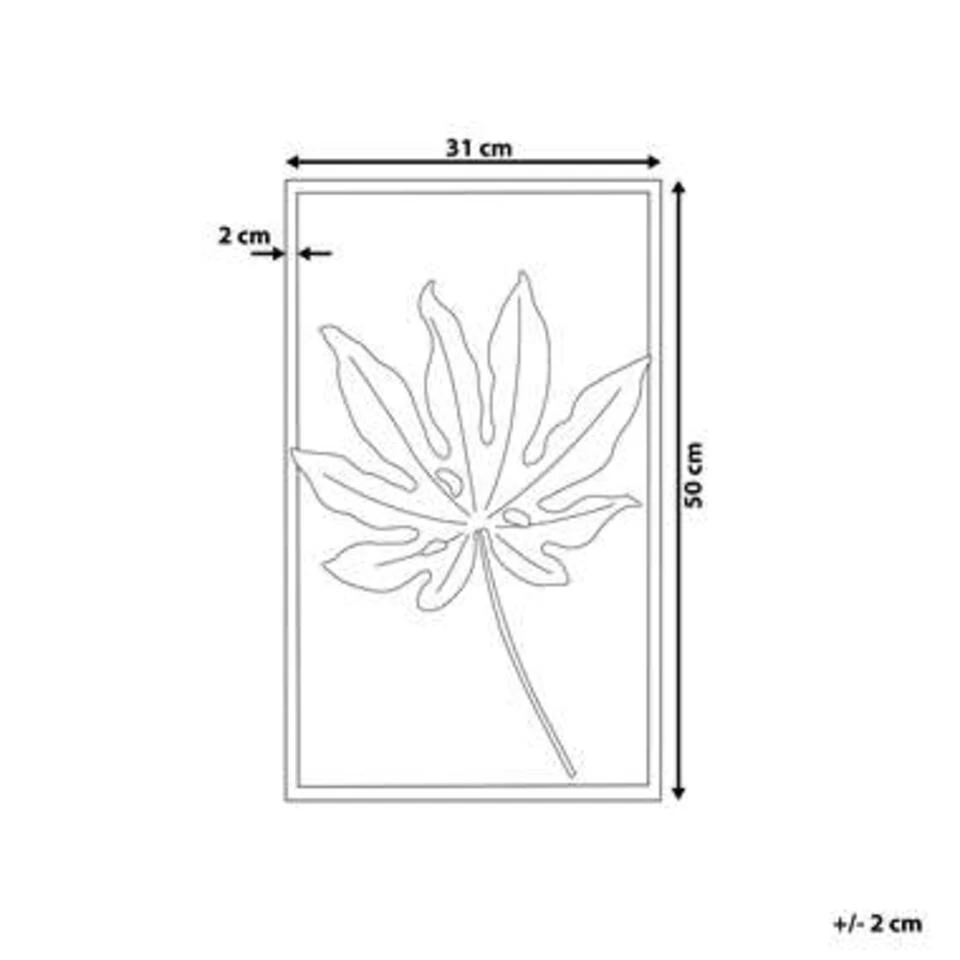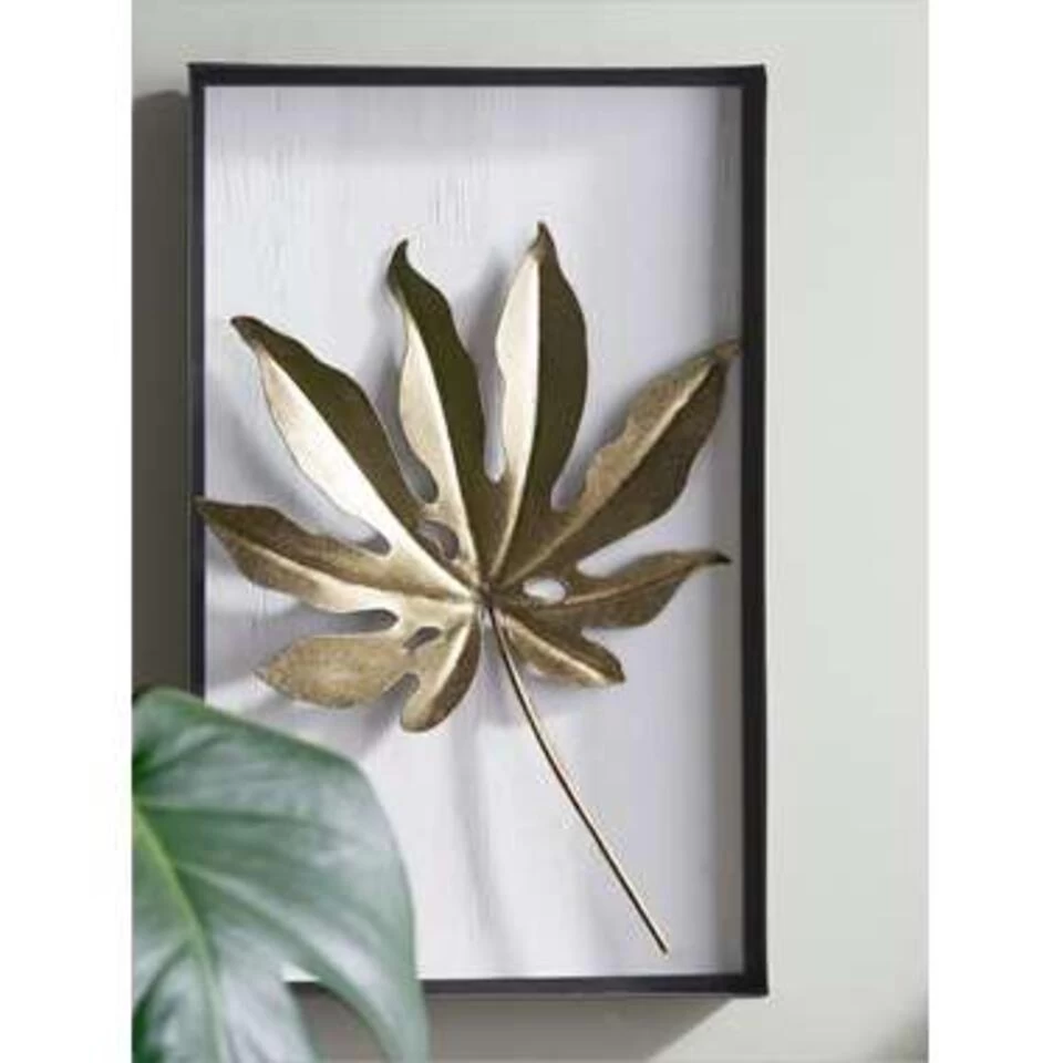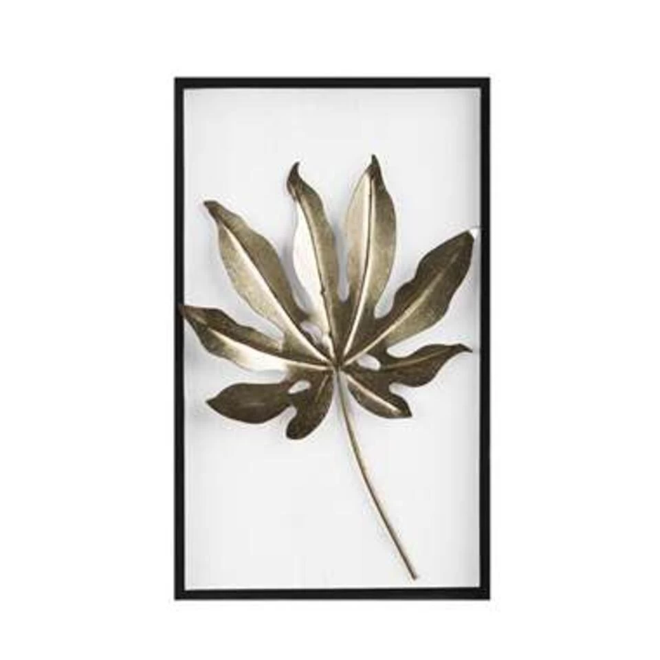 Gouden wanddecoratie. Deze decoratieve wanddecoratie maakt de muur tot een echte blikvanger en geeft elke kamer een chique, exotische flair. Dit goudkleurige blad in het zwarte frame geeft een stijlvolle toets en straalt klasse en elegantie uit door de metaalachtige glans.