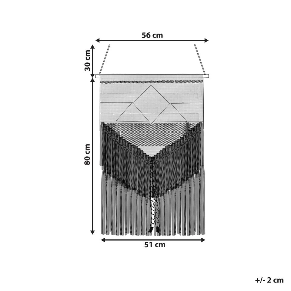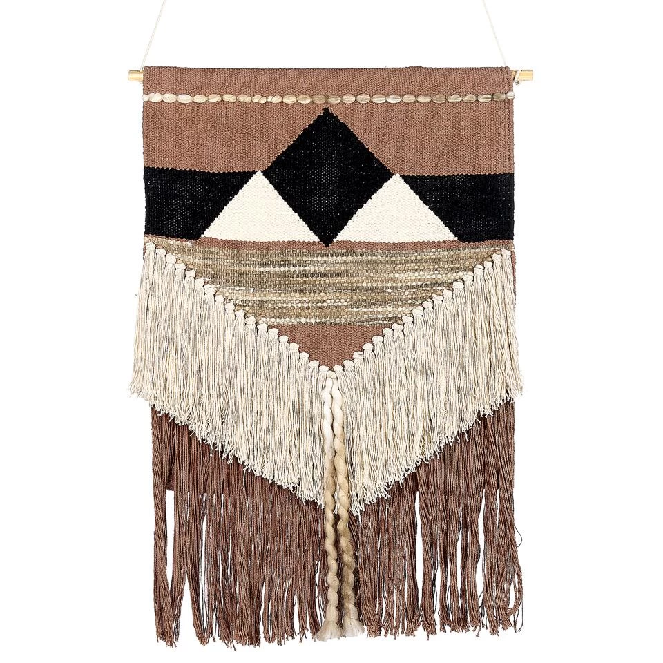 Handgemaakte boho wandhanger met franjes. Breng boho-stijl naar je woon- of slaapkamer met deze wanddecoratie. De bruin met beige wandhanger is afgewerkt met stijlvolle franjes en een zwart-wit geometrisch patroon. De decoratie is gemaakt van handgeweven hoogwaardig katoen, dat duurzaam en duurzaam is. Dankzij het unieke design past de wanddecoratie in veel verschillende interieurs.