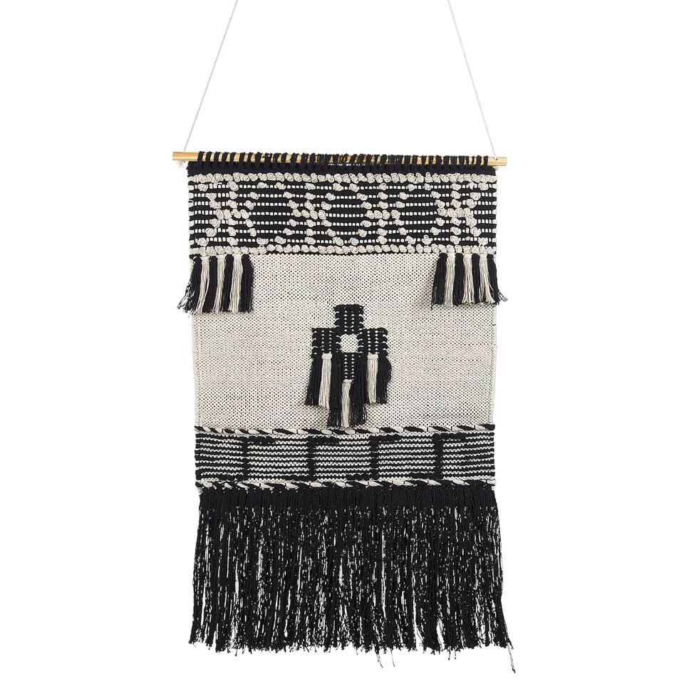 Handgemaakte boho wandhanger met franjes. Creëer een stijlvol en gezellig interieur met deze prachtige wanddecoratie. Gemaakt van duurzaam en hoogwaardig katoen, blijft de decoratie jarenlang mooi. Het beige en zwarte geometrische patroon en de decoratieve franjes maken het ornament tot een unieke blikvanger in elke ruimte.