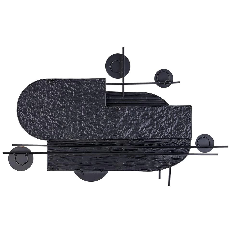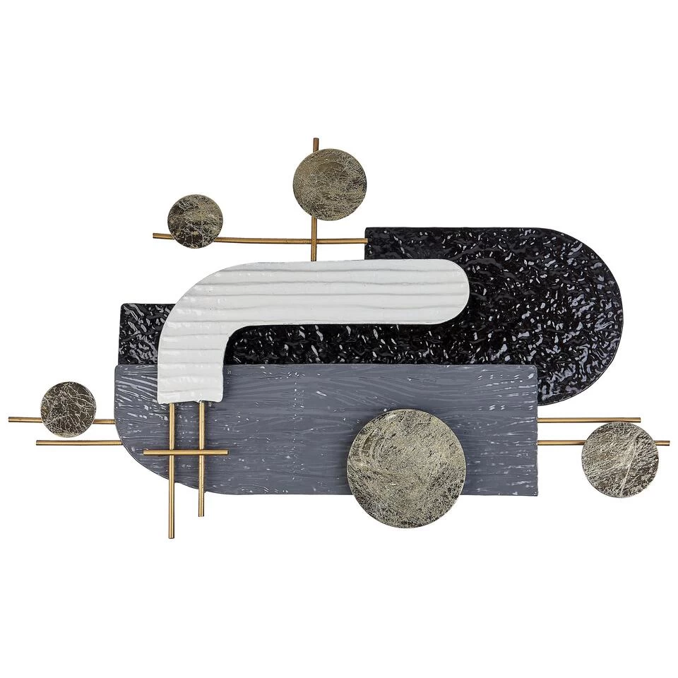 Metalen wandkunst. Deze geometrische wanddecoratie, handgemaakt van metaal, geeft een luxe flair aan een interieur. De combinatie van zwart en grijs met metallic accenten maakt het een elegante toevoeging die het ontwerp van elke kamer naar een hoger niveau zal tillen. Mooi en duurzaam, het ziet er geweldig uit in een moderne slaapkamer of woonkamer.