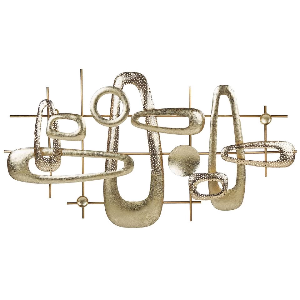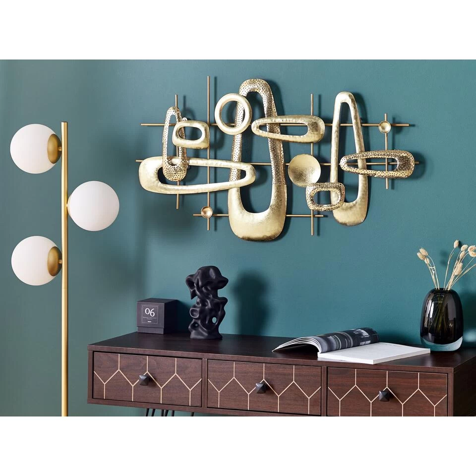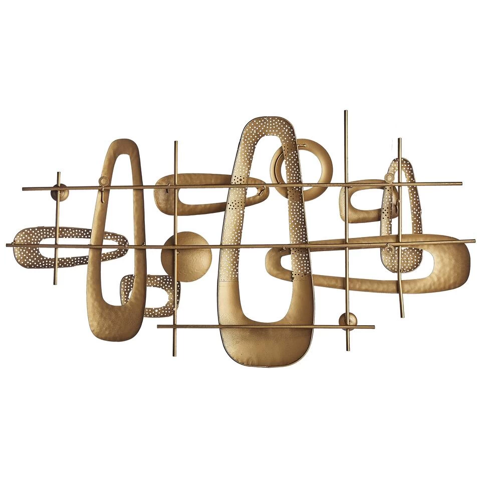 Metalen wandkunst. Dit hangende stuk is ontworpen om indruk te maken en laat elke muur opvallen. Grote abstracte elementen die op haarspelden lijken, creëren samen een decorstuk dat je aan het denken zet over de betekenis ervan. Dit ornament is gemaakt van metaal met een luxe goudfolie-afwerking en zal een glamoureuze uitstraling aan de ruimte geven.