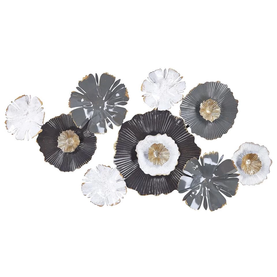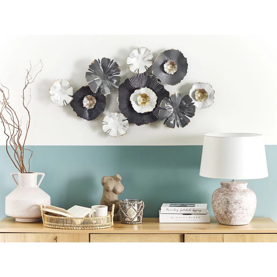 Metalen wanddecoratie. Laat je inspireren en voeg ook decoraties toe aan de muren. De metalen sculptuur kan over een ladekast of een open haard worden gehangen om het uiterlijk van een bepaalde kamer te verbeteren. Gouden accenten fleuren de universele tinten wit en grijs mooi op, die in combinatie met een verweerd effect uitstekend passen bij verschillende interieurontwerpen.