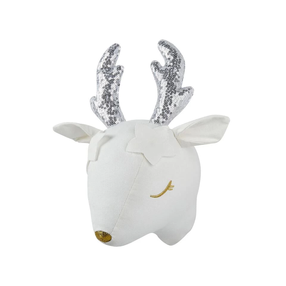 Herten hoofd speelgoed decoratie. Deze decoratie in de vorm van een prachtig hert is de perfecte aanvulling op elke prinsen of prinsessenkamer. Het prachtige glitter gewei en de gouden neus geven het een uniek karakter die perfect past bij de witte katoen stof. De zachte vulling zorgen ervoor dat het niet alleen als decoratie maar ook als speelgoed kan worden gebruikt.