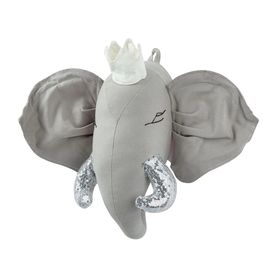 Olifant hoofd speelgoed decoratie. Geef je kindje een uniek karakter in de kinderkamer met deze decoratie. Het pluche wanddecoratie in de vorm van een olifant zal iedereen charmeren. De zilveren glitter slagtanden en het kroontje geven het een prachtige sfeer. Plaats hem boven je bed met andere accessoires zodat je kindje van zijn eigen kamer kan genieten.