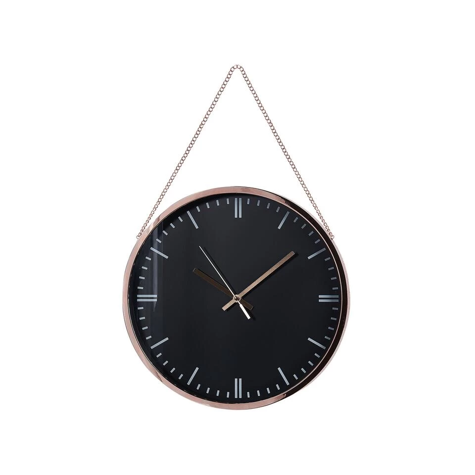 Moderne Wandklok. Hang deze klok in je woonkamer of hal om er meteen een nieuwe, moderne sfeer te creëren. Het is verfraaid met een dunne koperkleurige ketting, die perfect past bij de eenvoudige, zwarte wijzerplaat van de klok.
