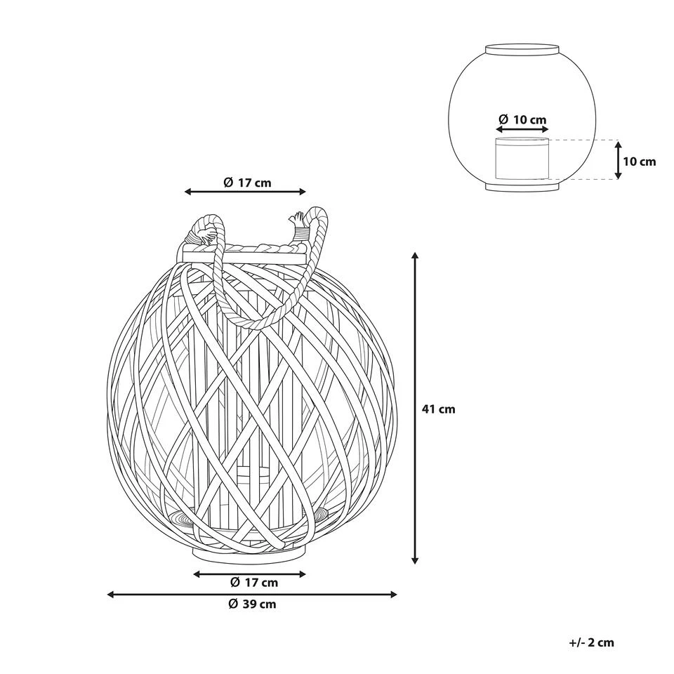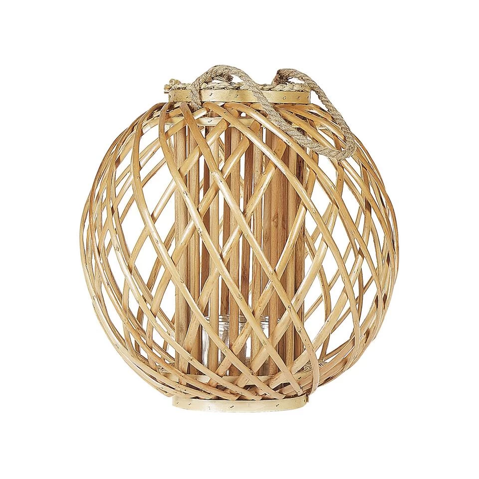 Mooie, decoratieve lantaarn met kaarshouder. Deze prachtige, heldere lantaarn past in alle woonkamers in alle decoratiestijlen. Het staat op een stabiele, ronde voet en heeft ook een handvat gemaakt van gevlochten touw om op te hangen en te dragen. Binnenin is een glazen kandelaar voor een sfeervolle, feestelijke sfeer.