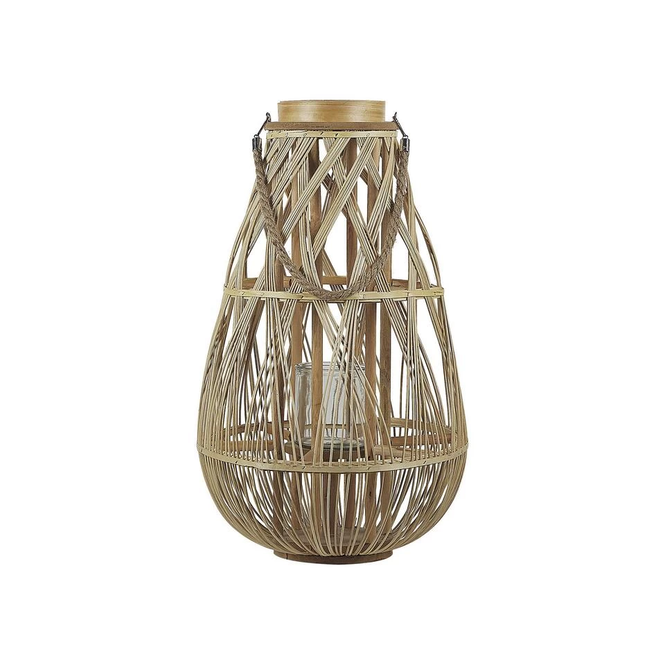 Hoge lantaarn van bamboe hout. Een lantaarn van gevlochten bamboehout zal een geweldige decoratie zijn voor een woonkamer of slaapkamer, hij zal ook op het terras werken. De handige, afneembare handgreep maakt hem gemakkelijk te dragen en de ronde basis zorgt voor stabiliteit. Binnenin de lantaarn zit een praktische glazen kandelaar.