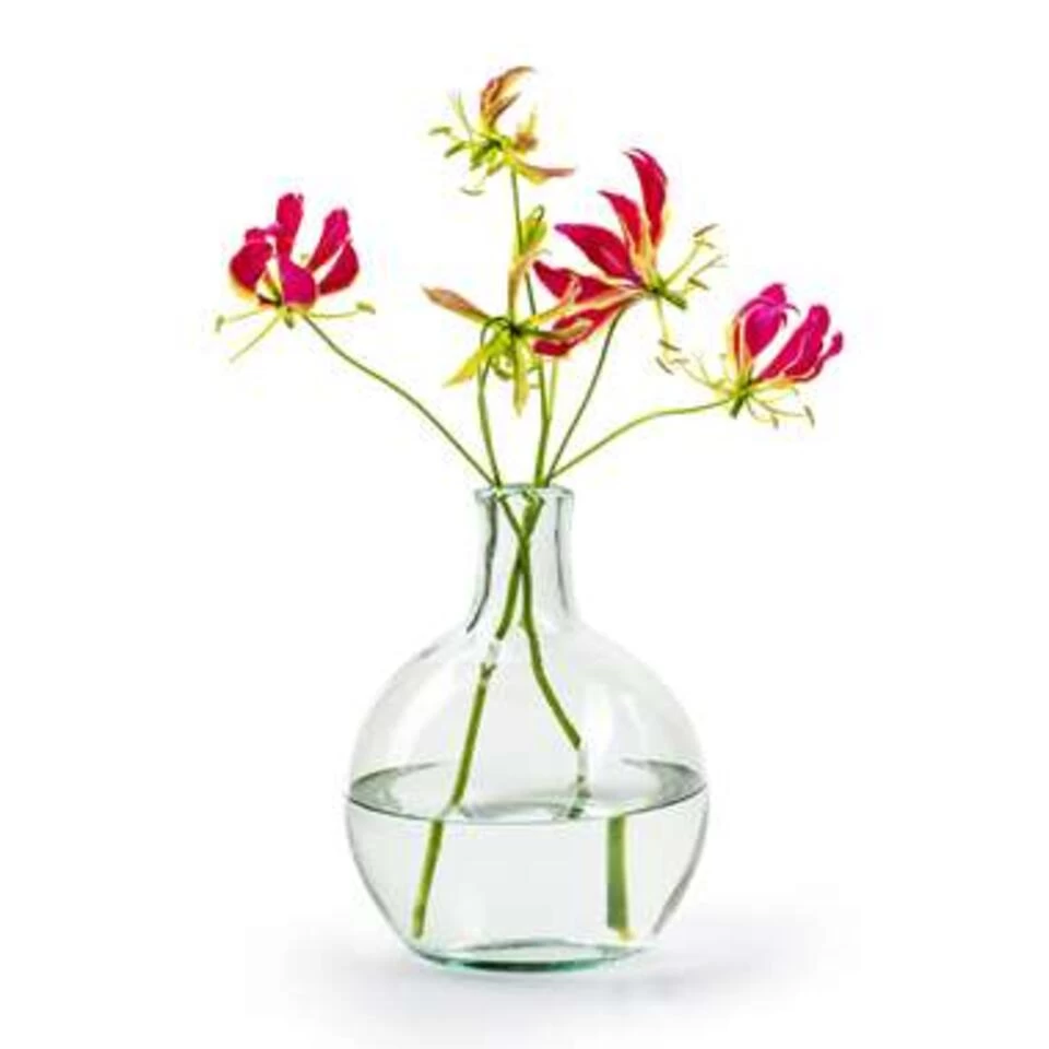 Transparante ronde fles vaas/vazen van glas 18 x 24 cm. Ronde flesvormige vaas. Geschikt om een klein boeket of losse bloemen in te plaatsen, maar ook leuk met (seizoensgebonden) decoratie.