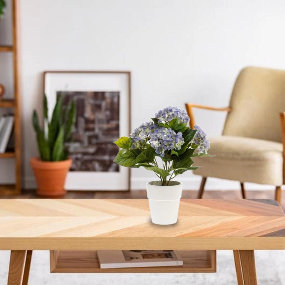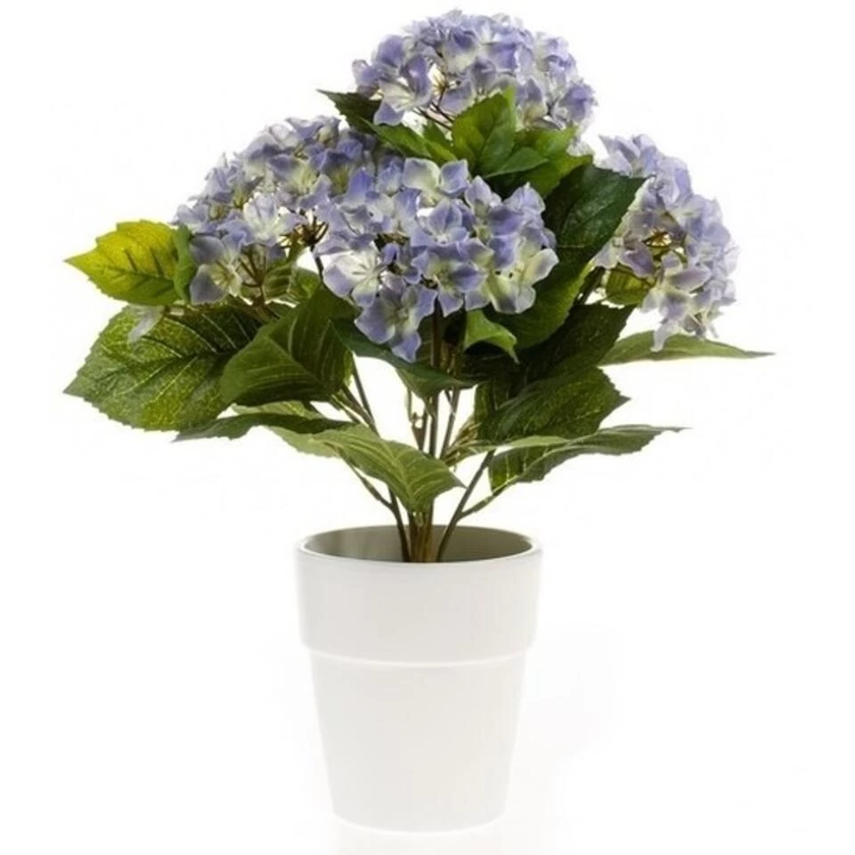 Kunstplant Hortensia blauw in witte pot. Deze blauwe Hortensia kunstplant heeft meerdere bladeren en bloemen en wordt geleverd in verzwaarde pot. Formaat: 37 cm. Materiaal plant: kunststof, pot: polystone.
