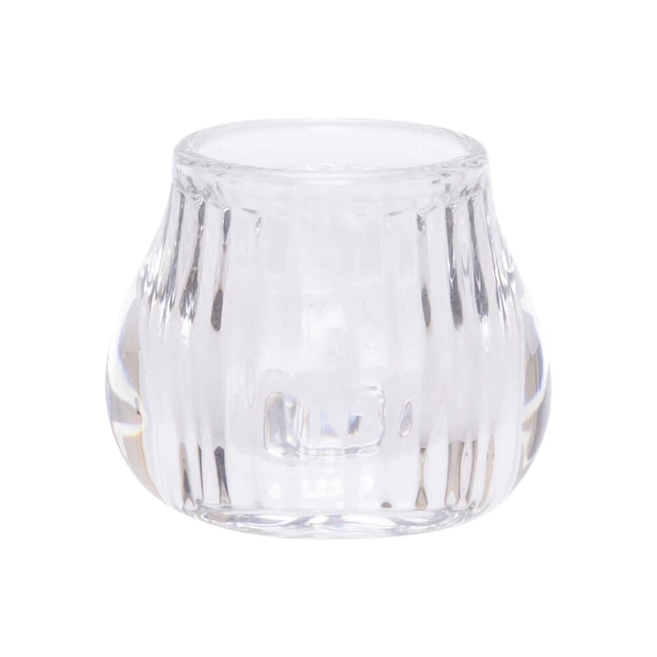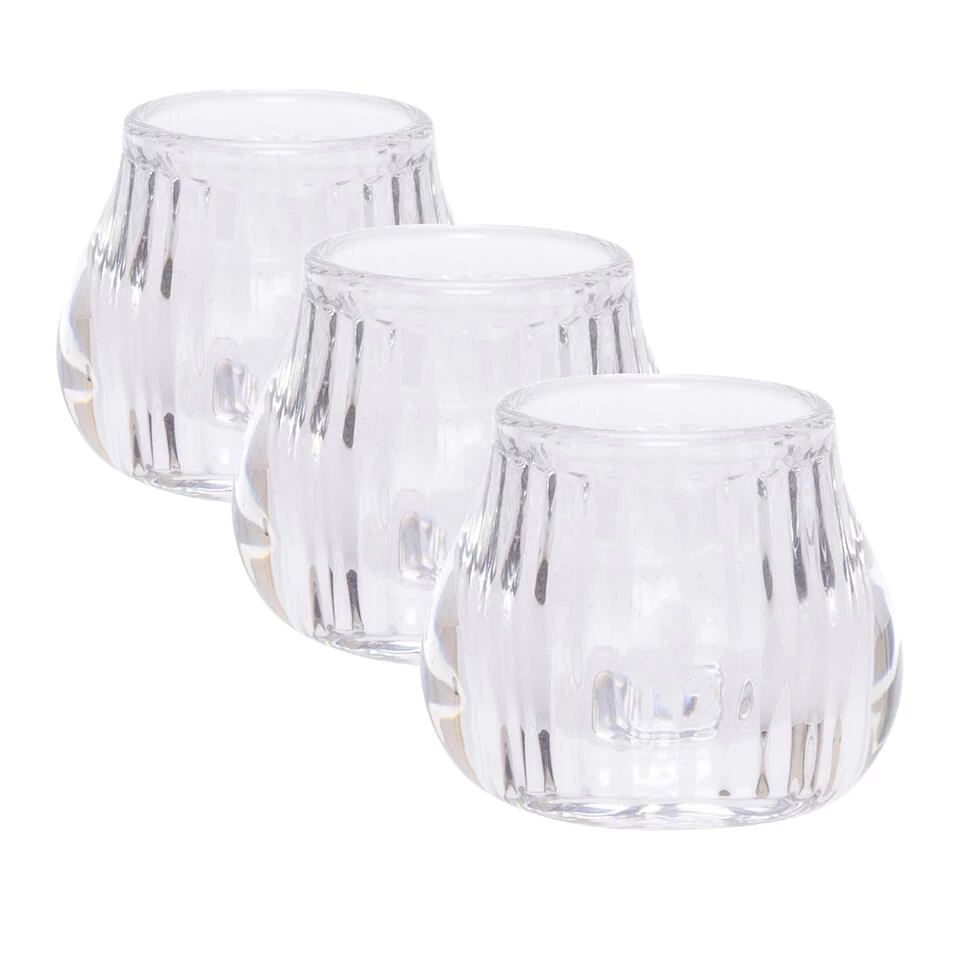 Ronde transparante theelichthouder / waxinelichthouder gemaakt van glas. Afmetingen: 8 x 8 x 6,8 cm. Geschikt voor theelichtjes / waxinelichtjes.