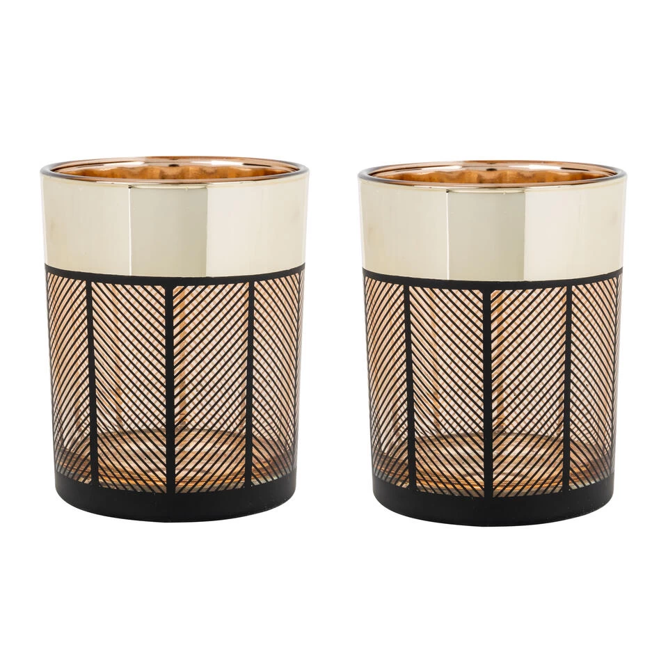Ronde theelichthouder / waxinelichthouder in de kleuren zwart en goud gemaakt van glas. Afmetingen: 10 x 10 x 13 cm. Geschikt voor theelichtjes / waxinelichtjes.