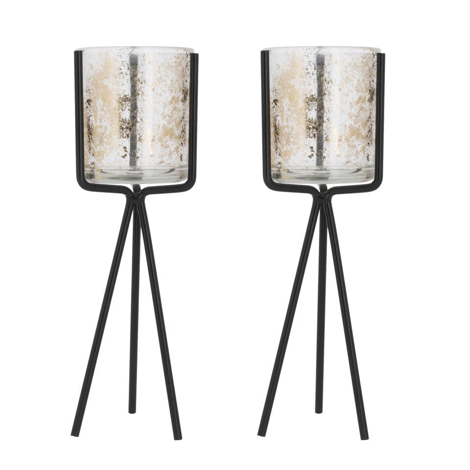 Ronde glazen theelichthouder / waxinelichthouder op zwart metalen voet. Afmetingen: 9,5 x 7,5 x 23 cm. Geschikt voor theelichtjes / waxinelichtjes.