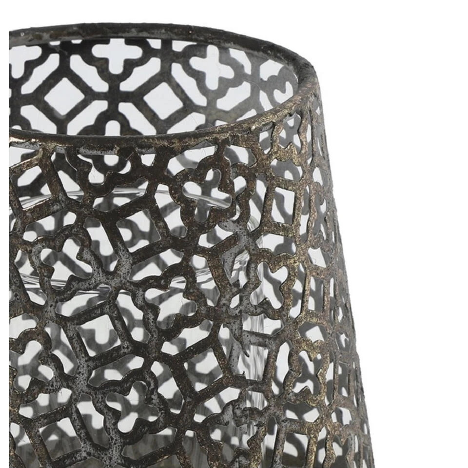 Luxe theelichthouder of kaarsenhouder voor waxinelichtjes met doorschijnend motief, gamaakt van metaal, in de kleur brons. Afmetingen: D10 x H11 cm. Plaats meerdere stuks of formaten van deze serie bij elkaar op tafel of vensterbank een maximale en stijlvolle sfeer. Serie: Morocco.