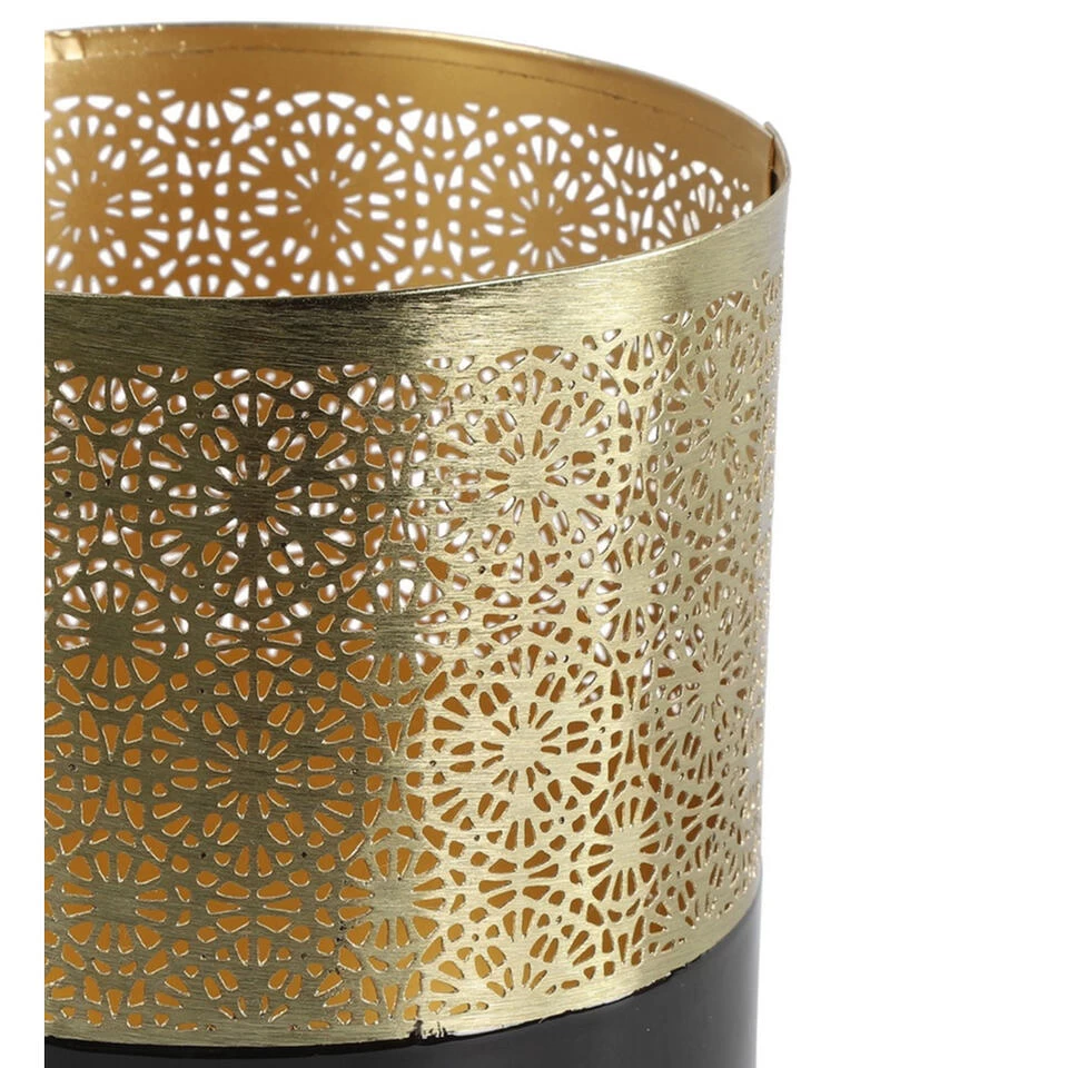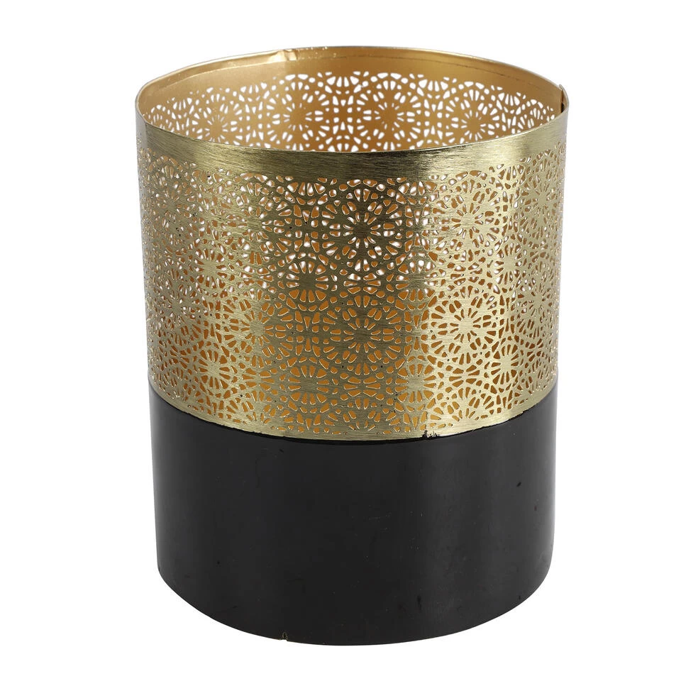 Luxe theelichthouder of kaarsenhouder voor waxinelichtjes met doorschijnend motief, gamaakt van metaal, in de kleur goud. Afmetingen: D12 x H15 cm. Plaats meerdere stuks of formaten van deze serie bij elkaar op tafel of vensterbank een maximale en stijlvolle sfeer. Serie: Dubai.
