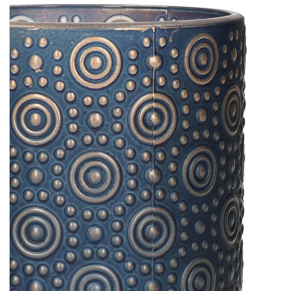 Luxe theelichthouder of kaarsenhouder voor waxinelichtjes van licht doorschijnend relief glas in de kleuren nachtblauw/goud. Afmetingen: D10 x H12 cm. Plaats meerdere formaten en of meerdere stuks van deze serie bij elkaar op een kaarsenbord voor een maximale en stijlvolle sfeer. Serie: Fantasy.