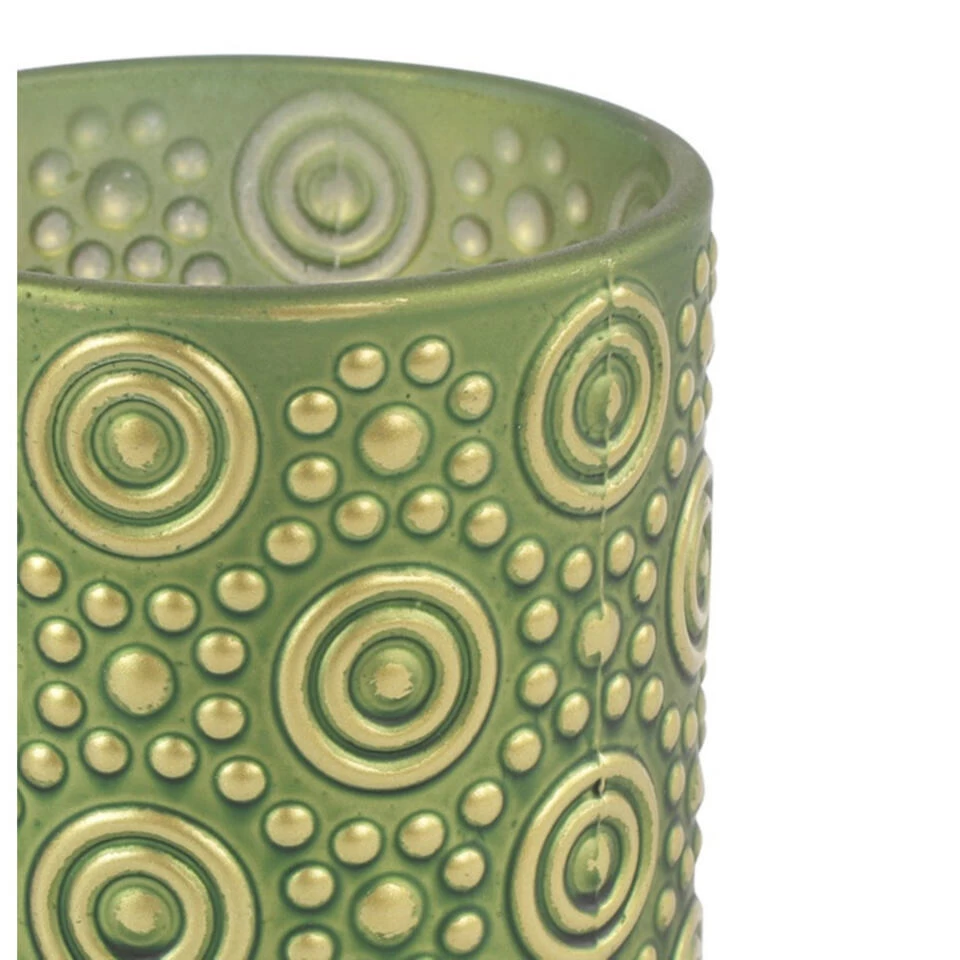 Luxe theelichthouder of kaarsenhouder voor waxinelichtjes van licht doorschijnend relief glas in de kleuren olijfgroen/goud. Afmetingen: D7 x H8 cm. Plaats meerdere formaten en of meerdere stuks van deze serie bij elkaar op een kaarsenbord voor een maximale en stijlvolle sfeer. Serie: Fantasy.