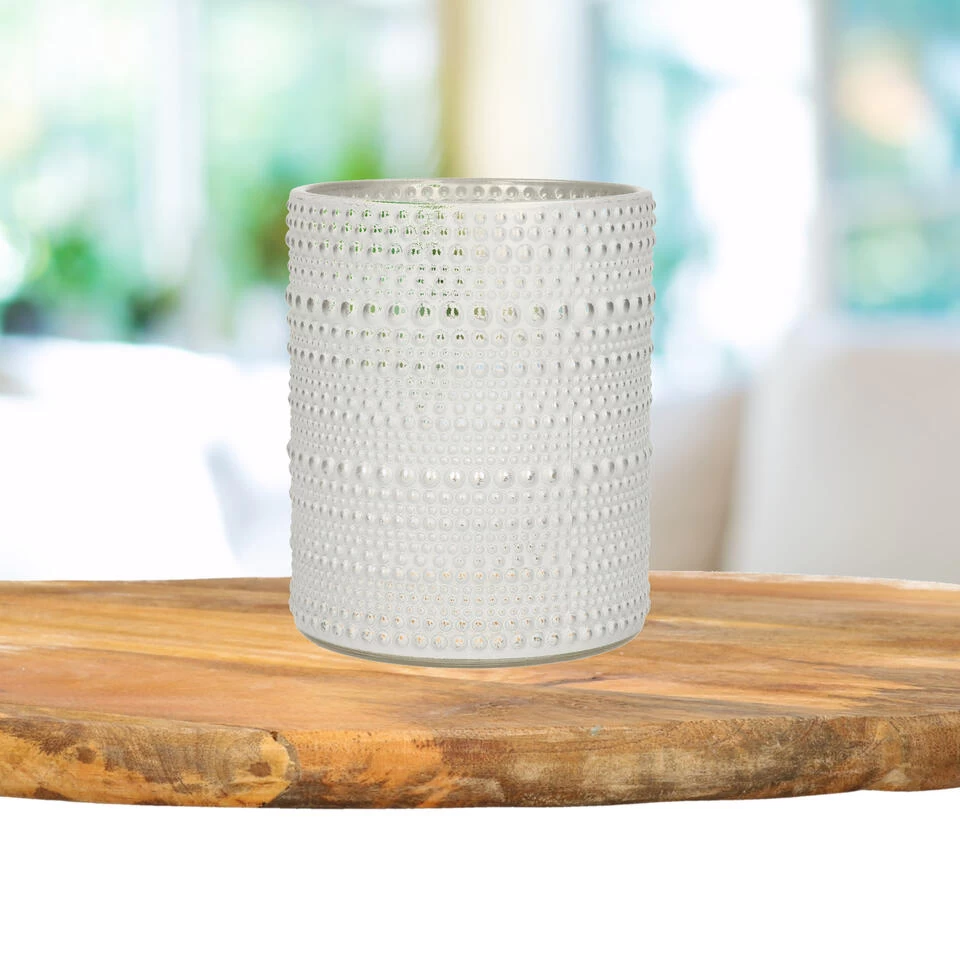 Luxe theelichthouder of kaarsenhouder voor waxinelichtjes van licht doorschijnend relief glas in de kleuren parel wit/zilver. Afmetingen: D7 x H8 cm. Plaats meerdere formaten en of meerdere stuks van deze serie bij elkaar op een kaarsenbord voor een maximale en stijlvolle sfeer. Serie: Aurora.