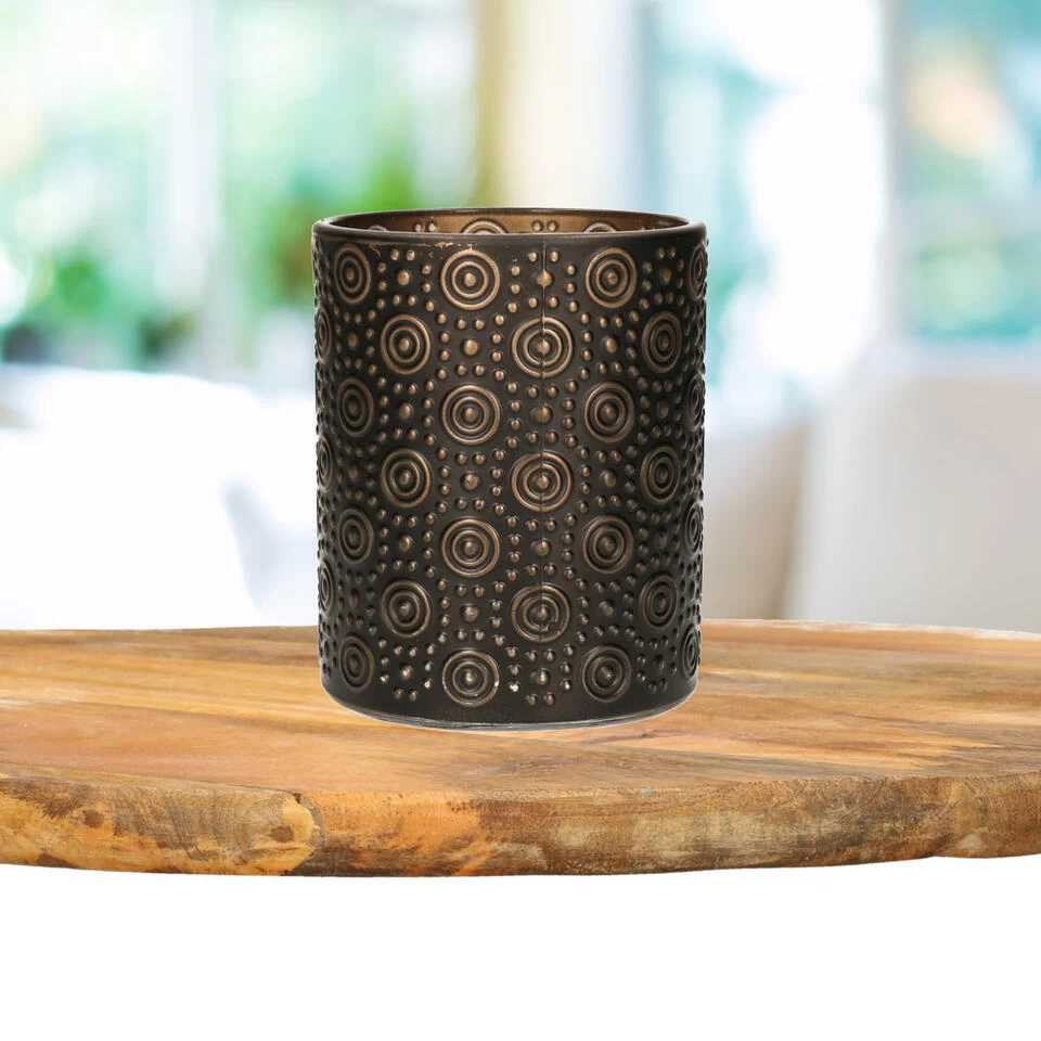 Luxe theelichthouder of kaarsenhouder voor waxinelichtjes van licht doorschijnend relief glas in de kleuren zwart/brons. Afmetingen: D10 x H12 cm. Plaats meerdere formaten en of meerdere stuks van deze serie bij elkaar op een kaarsenbord voor een maximale en stijlvolle sfeer. Serie: Fantasy.