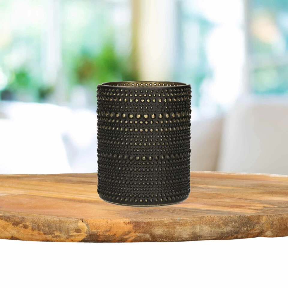 Luxe theelichthouder of kaarsenhouder voor waxinelichtjes van licht doorschijnend relief glas in de kleuren zwart/goud. Afmetingen: D10 x H12 cm. Plaats meerdere formaten en of meerdere stuks van deze serie bij elkaar op een kaarsenbord voor een maximale en stijlvolle sfeer. Serie: Aurora.