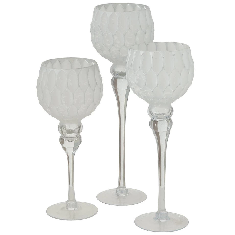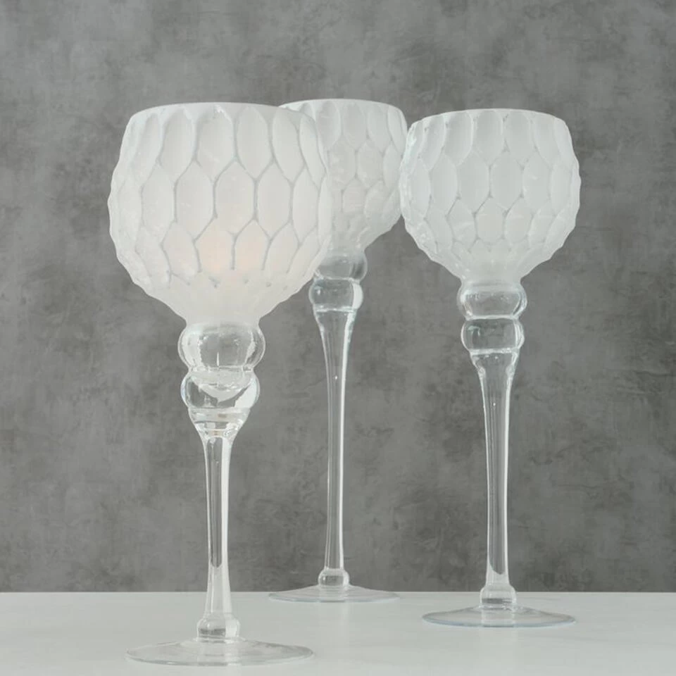 Luxe glazen design kaarsenhouders/windlichten set van 3x delig stuks zilver/wit met formaat tussen de 30 en 40 cm. Waxinelichtjes/theelichtjes sfeer kandelaars. Strakke design stijl. Materiaal: gelaagd glas. Voor een super sfeervolle woonkamer.