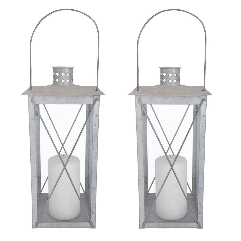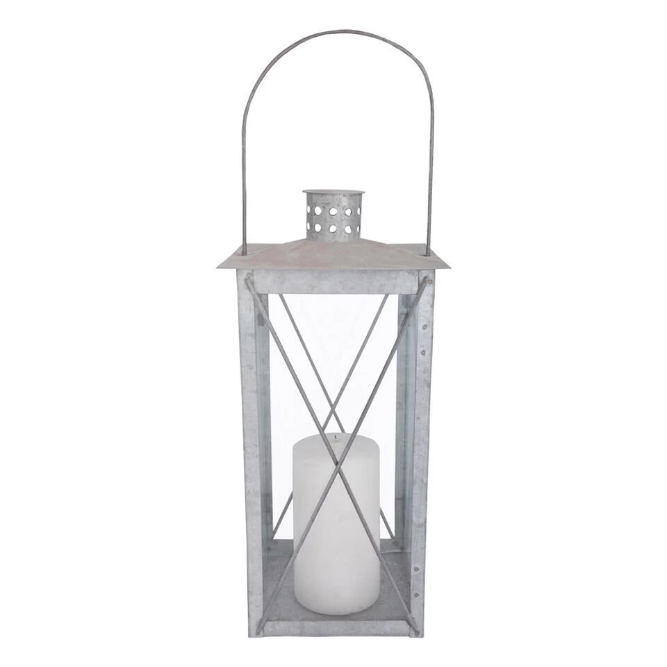 Zilveren tuin lantaarn/windlicht van zink. Zinken decoratie lantaarn geschikt voor binnen en buitenshuis. Door het dak naar boven te schuiven is het makkelijk om een theelicht of kaars te plaatsen en aan te steken (kaarsen zijn niet inbegrepen). Materiaal: zink/glas. Formaat: 17,2 x 17,2 x 36,5 cm.