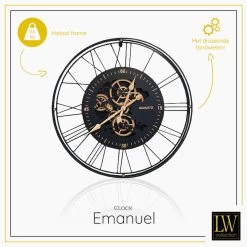 LW Collection Wandklok Radar Emanuel Zwart 62cm Bewegende Tandwielen