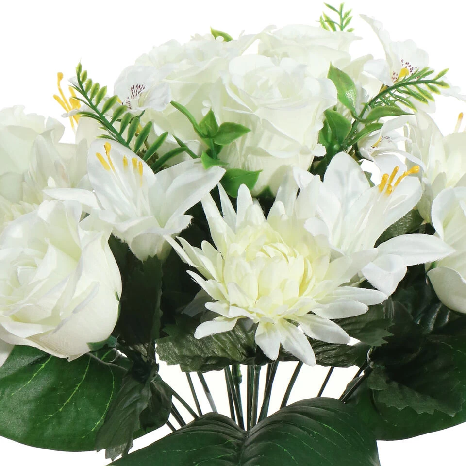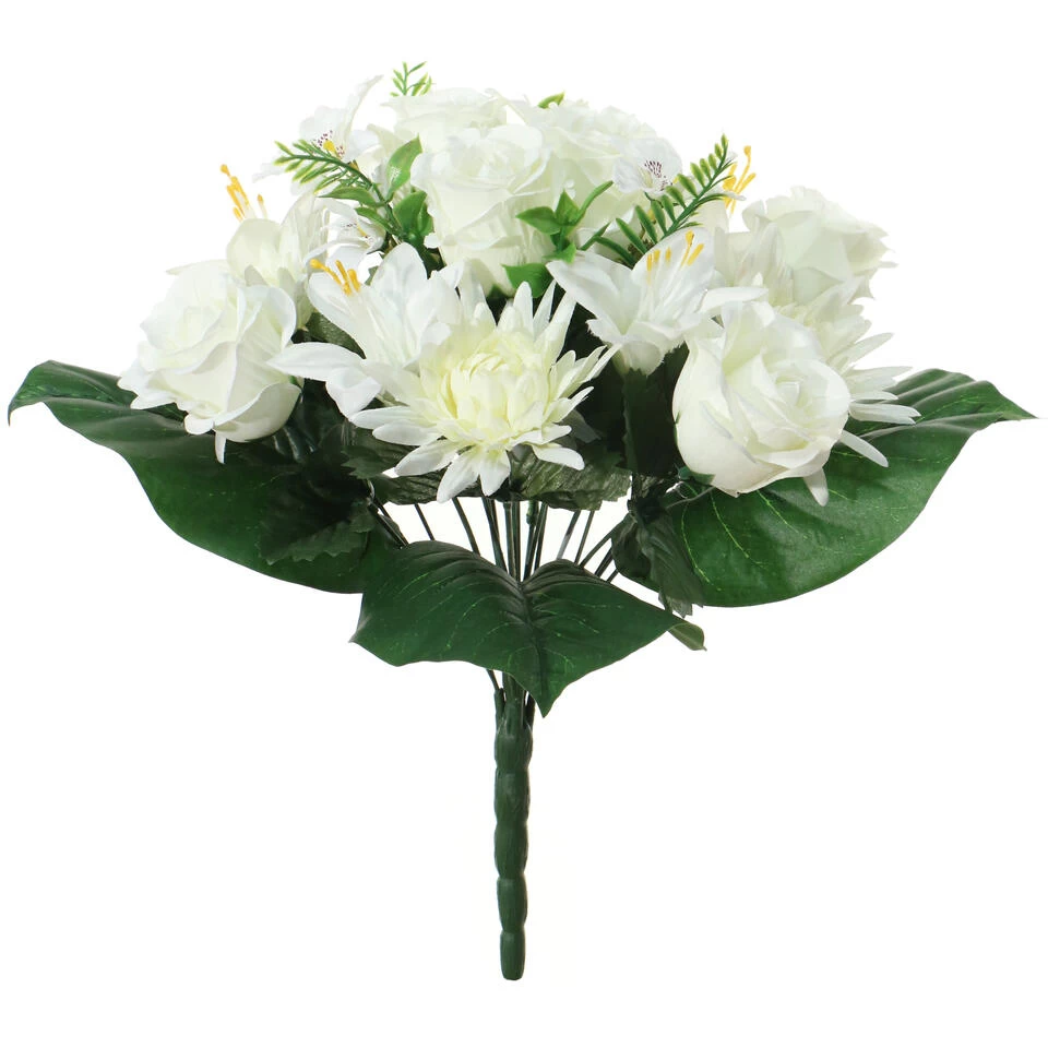 Kunstbloemen boeket met bloemsoorten roos/orchidee/chrysant in kleur wit met afmeting van ongeveer H36 cm. Combinatie van kleur wit met bladgroen. Bloemenstuk tafel ornament. Zeer realistisch uitziende, onderhoudsvrije bloemen. Materiaal: pvc/polyester. Woondecoraties voor in huis. Enkel nog even in een mooie vaas plaatsen en genieten. Ook perfect te gebruiken als grafstuk/grafornament in een grafvaasje.