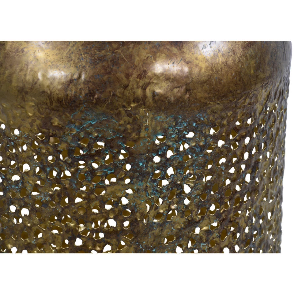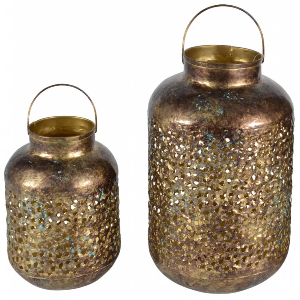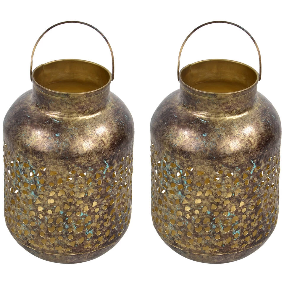Metalen lantaarn/windlicht goud grof 15 x 23 cm. Deze mooie lantaarn van metaal heeft een grof gaatjes patroon en vintage gouden afwerking voor een antieke uitstraling. De lantaarn kan worden neergezet of opgehangen aan het stevige handvat.