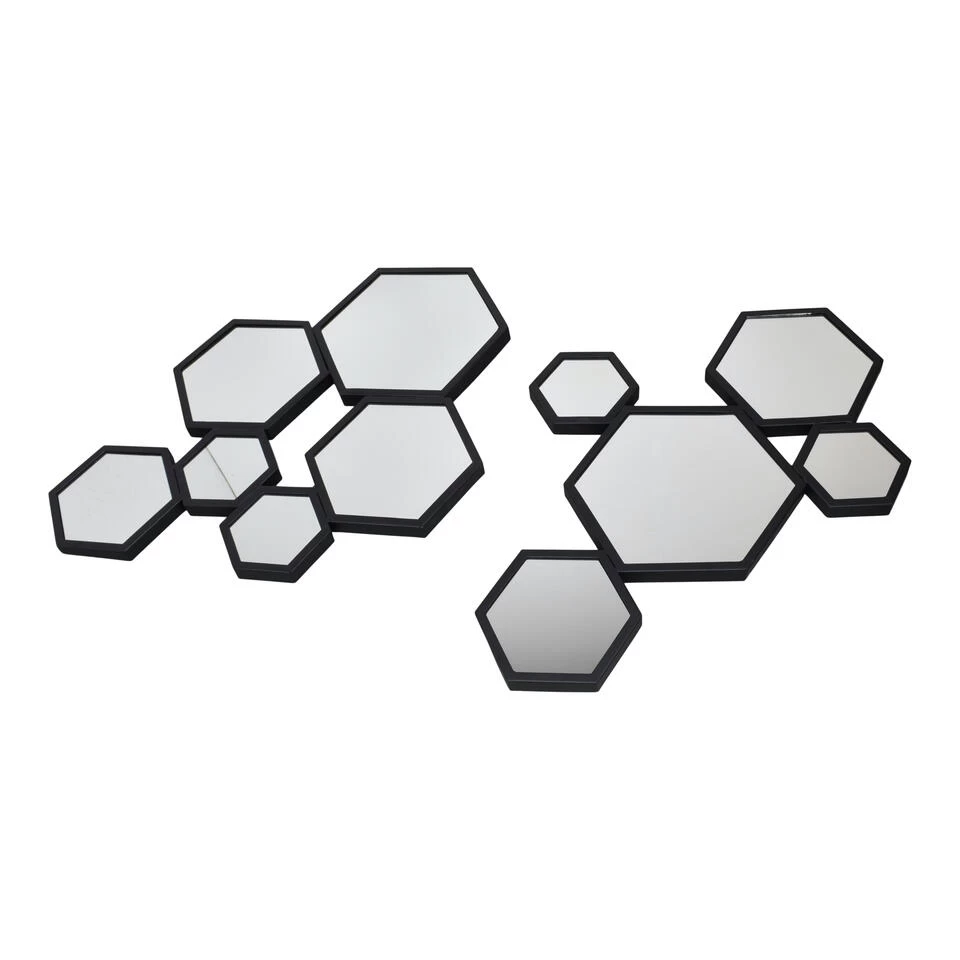 De twee delen van de LOFT42 Bubbles Multi Spiegel bestaat uit 6 en 5 zeshoekige spiegels van verschillende groottes aan elkaar vast en is afgewerkt met een mat zwart metalen rand. Hierdoor heeft de spiegel een speelse en eigentijdse uitstraling.