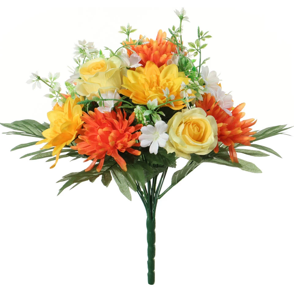 Kunstbloemen boeket met bloemsoorten roos/dahlia in kleur oranje/geel met afmeting van ongeveer H36 cm. Combinatie van kleur oranje/geel met bladgroen. Bloemenstuk tafel ornament. Zeer realistisch uitziende, onderhoudsvrije bloemen. Materiaal: pvc/polyester. Woondecoraties voor in huis. Enkel nog even in een mooie vaas plaatsen en genieten. Ook perfect te gebruiken als grafstuk/grafornament in een grafvaasje.