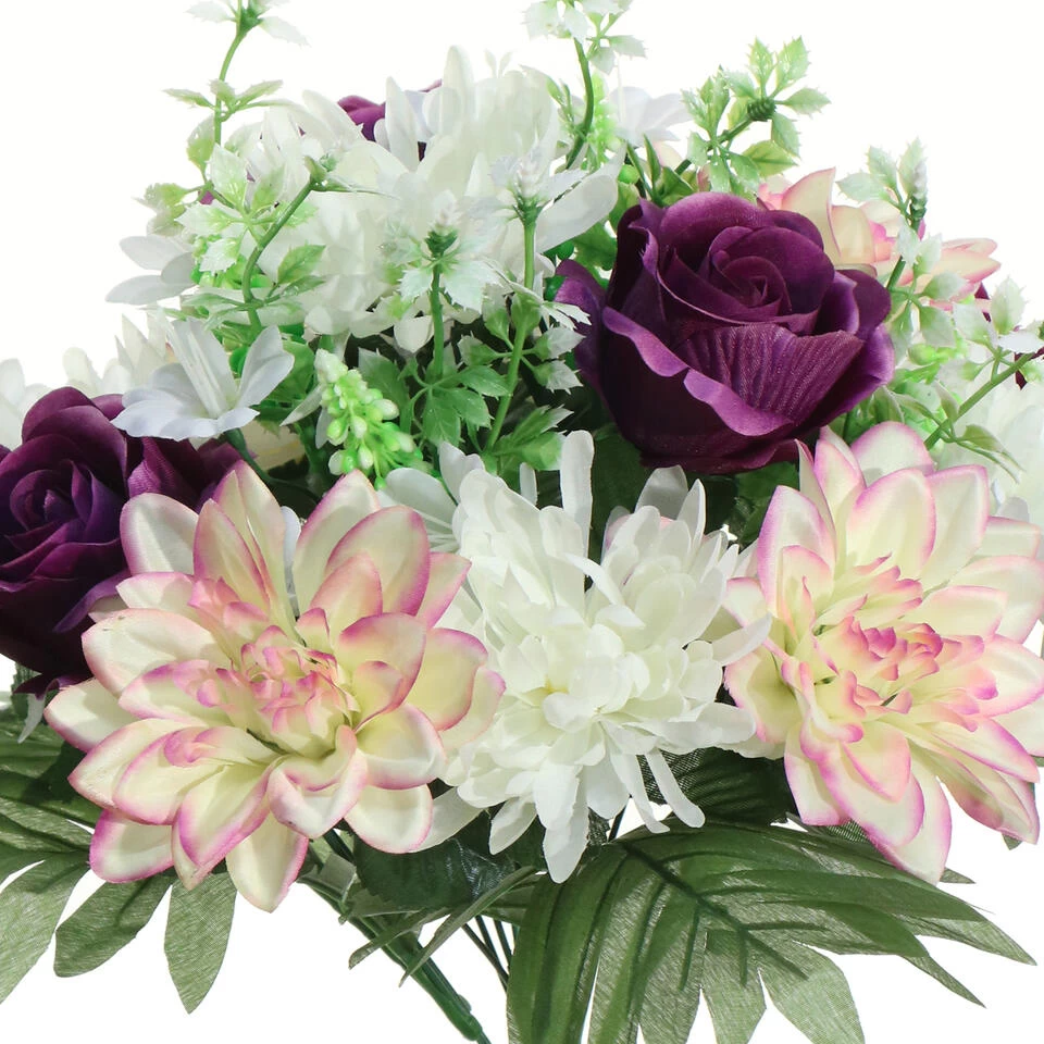 Kunstbloemen boeket met bloemsoorten roos/dahlia in kleur paars/creme met afmeting van ongeveer H36 cm. Combinatie van kleur paars/creme met bladgroen. Bloemenstuk tafel ornament. Zeer realistisch uitziende, onderhoudsvrije bloemen. Materiaal: pvc/polyester. Woondecoraties voor in huis. Enkel nog even in een mooie vaas plaatsen en genieten. Ook perfect te gebruiken als grafstuk/grafornament in een grafvaasje.