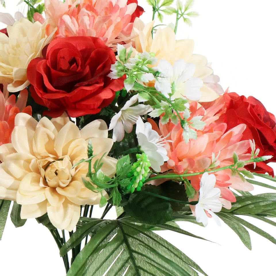 Kunstbloemen boeket met bloemsoorten roos/dahlia in kleur rood/zalm met afmeting van ongeveer H36 cm. Combinatie van kleur rood/zalm met bladgroen. Bloemenstuk tafel ornament. Zeer realistisch uitziende, onderhoudsvrije bloemen. Materiaal: pvc/polyester. Woondecoraties voor in huis. Enkel nog even in een mooie vaas plaatsen en genieten. Ook perfect te gebruiken als grafstuk/grafornament in een grafvaasje.