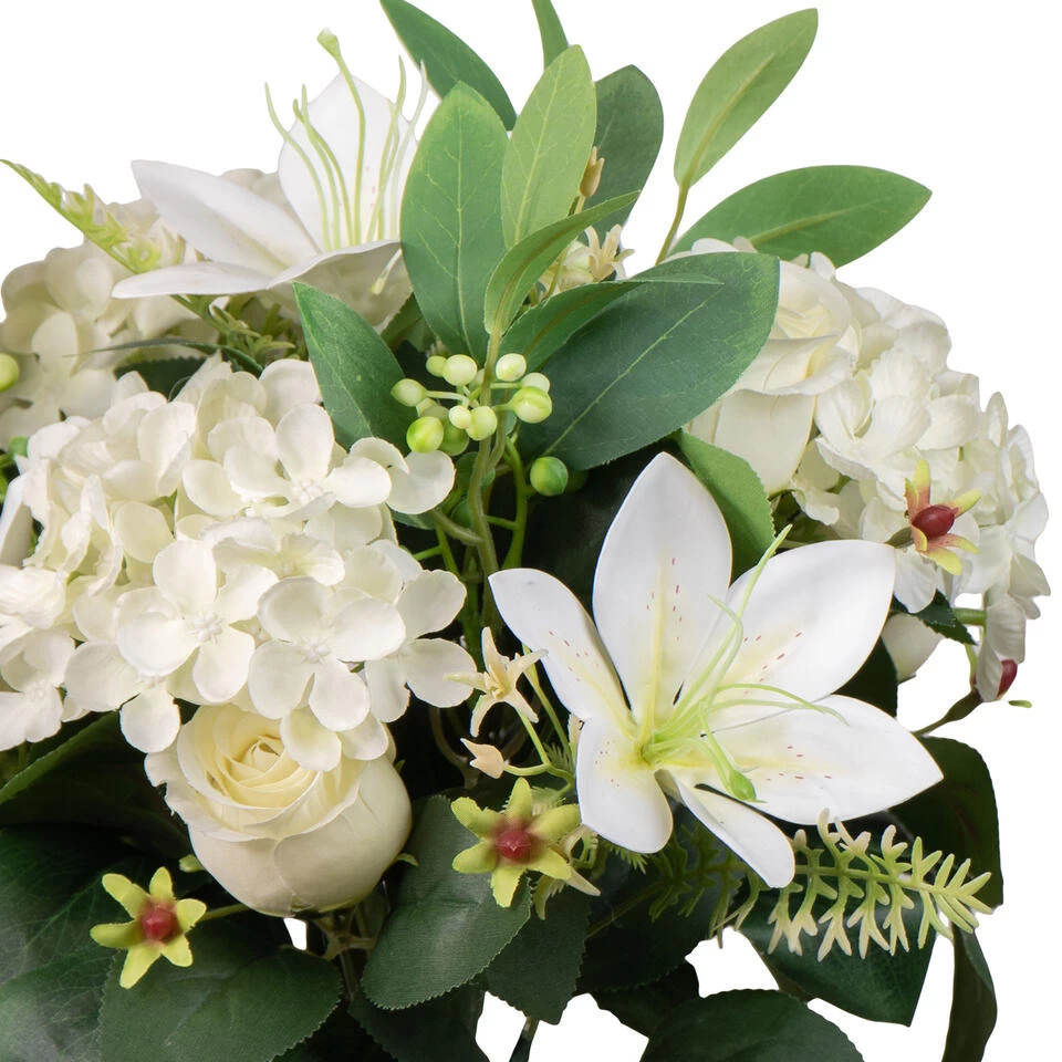 Kunstbloemen boeket met bloemsoorten roos/hortensia/lelie in kleur creme/wit met afmeting van ongeveer H39 cm. Combinatie van kleur creme/wit met bladgroen. Bloemenstuk tafel ornament. Zeer realistisch uitziende, onderhoudsvrije bloemen. Materiaal: pvc/polyester. Woondecoraties voor in huis. Enkel nog even in een mooie vaas plaatsen en genieten. Ook perfect te gebruiken als grafstuk/grafornament in een grafvaasje.