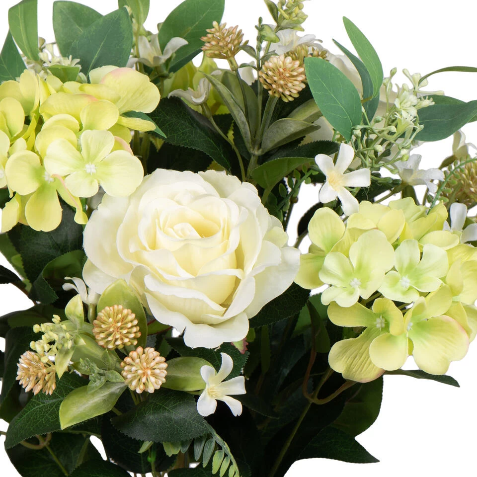 Kunstbloemen boeket met rozen, hortensia en bladgroen in kleur creme wit/geel met afmeting van ongeveer H52 cm. Combinatie van kleur tinten creme wit/geel met bladgroen. Bloemenstuk tafel ornament. Zeer realistisch uitziende, onderhoudsvrije bloemen. Materiaal: pvc/polyester. Woondecoraties voor in huis. Enkel nog even in een mooie vaas plaatsen en genieten. Ook perfect te gebruiken als grafstuk/grafornament in een grafvaasje.