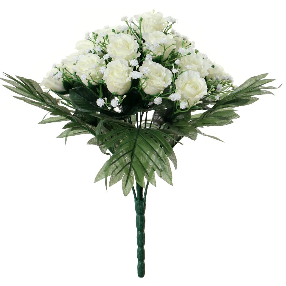 Kunstbloemen boeket met rozen en gipskruid in kleur wit met afmeting van ongeveer H36 cm. Combinatie van kleur wit met bladgroen. Bloemenstuk tafel ornament. Zeer realistisch uitziende, onderhoudsvrije plant met bloemen. Materiaal: pvc/polyester. Woondecoraties voor in huis. Enkel nog even in een mooie vaas plaatsen en genieten. Ook perfect te gebruiken als grafstuk/grafornament in een grafvaasje.
