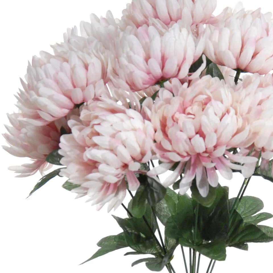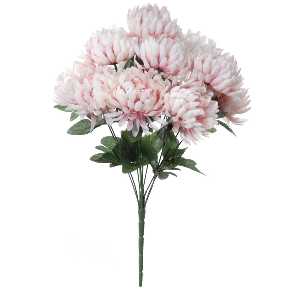 Kunstbloemen boeket met crysanten en bladgroen in kleur lichtroze met afmeting van ongeveer H45 cm. Combinatie van kleur tinten lichtroze met bladgroen. Bloemenstuk van sierbloemen tafel ornament. Zeer realistisch uitziende, onderhoudsvrije bloemen. Materiaal: pvc/polyester. Woondecoraties voor in huis. Enkel nog even in een mooie vaas plaatsen en genieten. Ook perfect te gebruiken als grafstuk/grafornament in een grafvaasje.