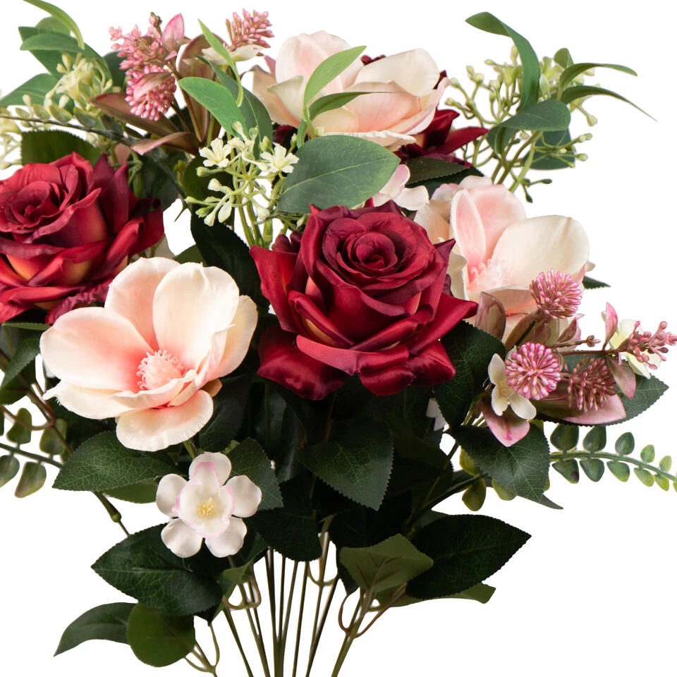 Kunstbloemen boeket met rozen, magnolia en bladgroen in kleur rood/roze met afmeting van ongeveer H50 cm. Combinatie van kleur tinten rood/roze met bladgroen. Bloemenstuk tafel ornament. Zeer realistisch uitziende, onderhoudsvrije bloemen. Materiaal: pvc/polyester. Woondecoraties voor in huis. Enkel nog even in een mooie vaas plaatsen en genieten. Ook perfect te gebruiken als grafstuk/grafornament in een grafvaasje.