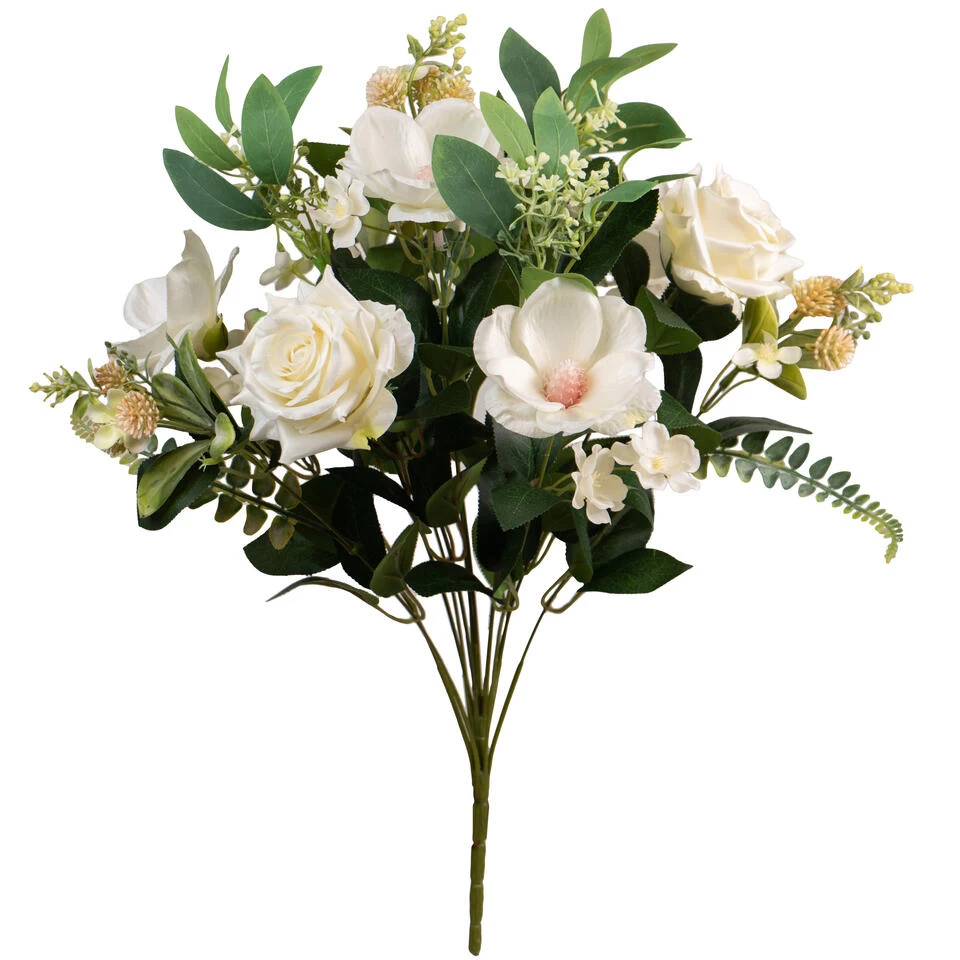 Kunstbloemen boeket met rozen, magnolia en bladgroen in kleur wit met afmeting van ongeveer H50 cm. Combinatie van kleur tinten wit met bladgroen. Bloemenstuk tafel ornament. Zeer realistisch uitziende, onderhoudsvrije bloemen. Materiaal: pvc/polyester. Woondecoraties voor in huis. Enkel nog even in een mooie vaas plaatsen en genieten. Ook perfect te gebruiken als grafstuk/grafornament in een grafvaasje.