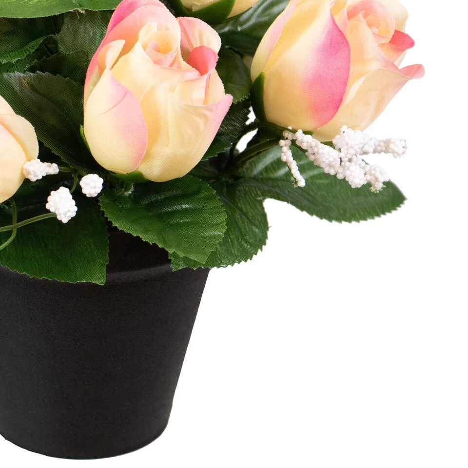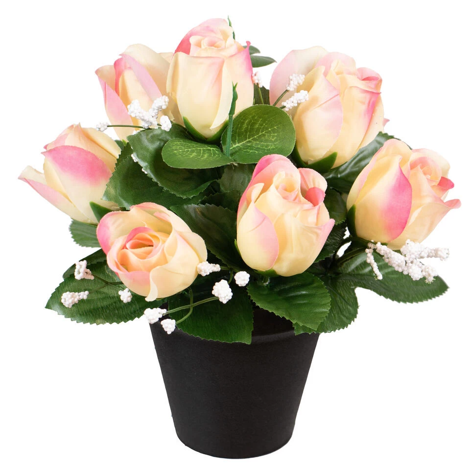 Kunstbloemen klein boeketje rozen in pot in kleur creme/lichtroze met afmeting van ongeveer H25 cm. Combinatie van kleuren creme/lichtroze met bladgroen. Bloemenstuk tafel ornament. Zeer realistisch uitziende, onderhoudsvrije plant met bloemen. Materiaal: pvc/polyester. Woondecoraties voor in huis. Enkel nog even in een mooie bloempot plaatsen en genieten. Ook perfect te gebruiken als grafstuk/grafornament.